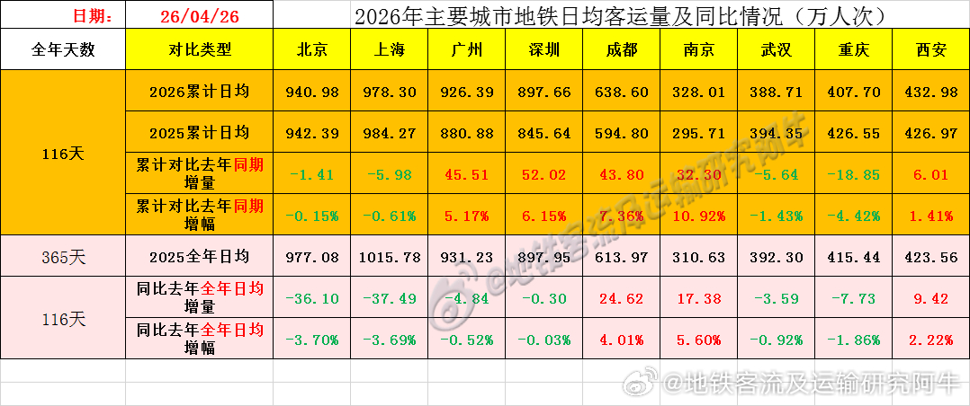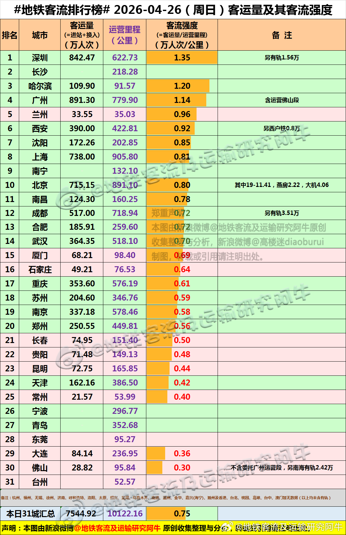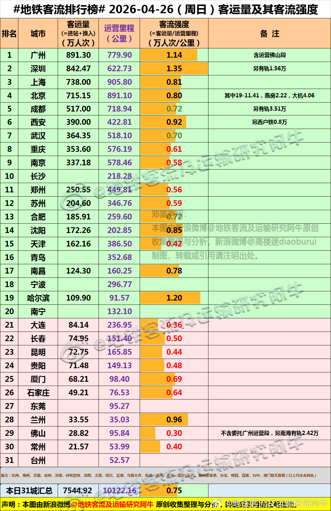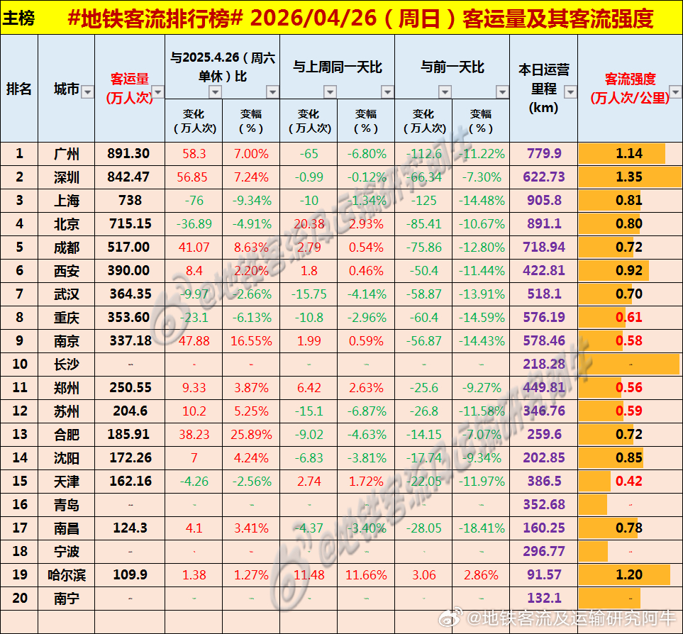 【中国城市地铁客流排行榜 2026-04-26(周日,农历三月初十,中国地铁客流日报】广州891.3万,深圳842.47万(另有轨1.56万),上海738万,北京715.15万(其中19-11.41,燕房2.22,大机4.06),成都517.00万(另有轨3.51万),西安390.0万(另西户铁路0.8万),武汉364.35万,重庆353.6万,……余见下表(1-客运量排序,2-客流强度排序)广州地铁深圳地铁上海地铁北京地铁成都地铁西安地铁武汉地铁重庆轨道交通南京地铁长沙地铁地铁客流及运输研究阿牛的微博