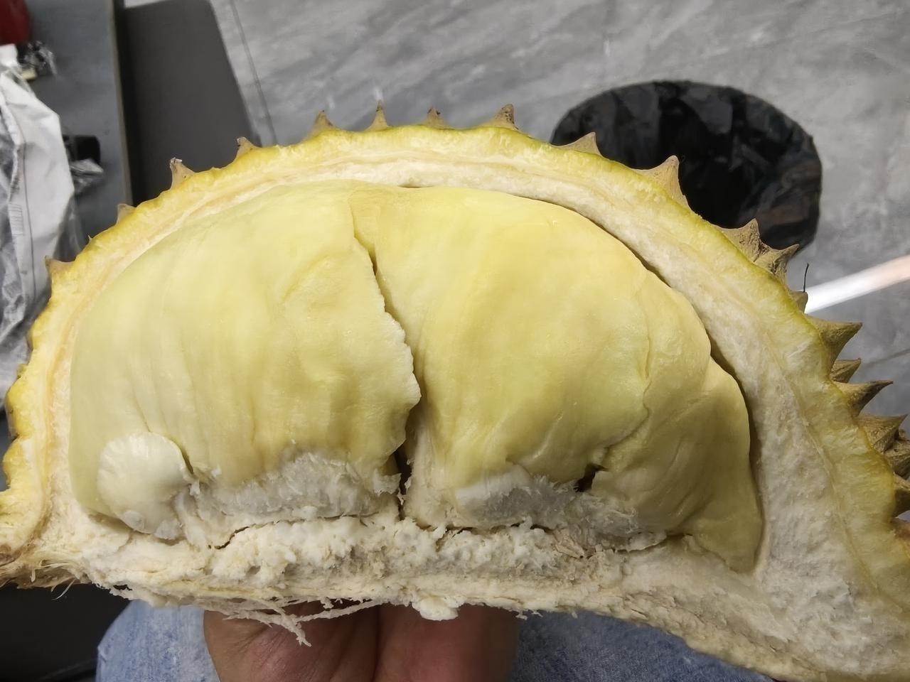 我买榴莲又得到了一个启发,我这次买的这个榴莲在买的时候,两只手轻轻的摇一下,听见里面有轻微的响声,这个榴莲是成熟了的,刚好合适,但是我拿回家的时候分来吃,没有我前次买的榴莲好吃,然后我就仔细的看,我发现了一个问题,这个榴莲外壳它上面的刺很短,然后我对比以前买的榴莲,因为我拍图片的我都看了一下,在选榴莲的时候还有一个细节,一定不要选榴莲壳上那个刺很短的那一种榴莲。虽然说他它成熟了的,但是他的口感没有榴莲壳上面刺长一点的好吃。