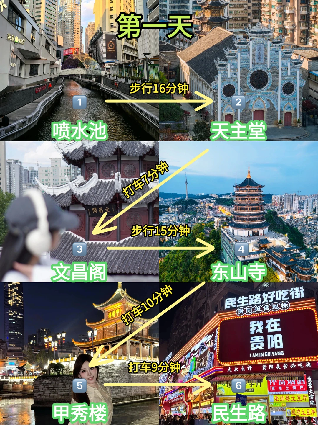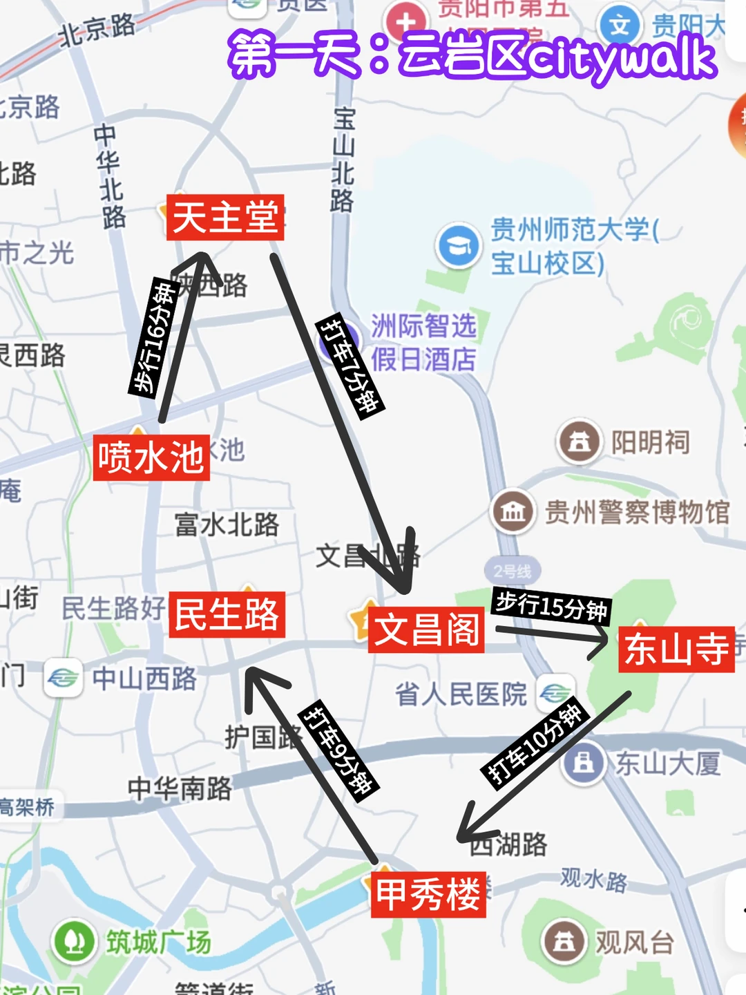 🚩路线:喷水池—天主堂—文昌阁—东山寺—甲秀楼—民生路好吃街