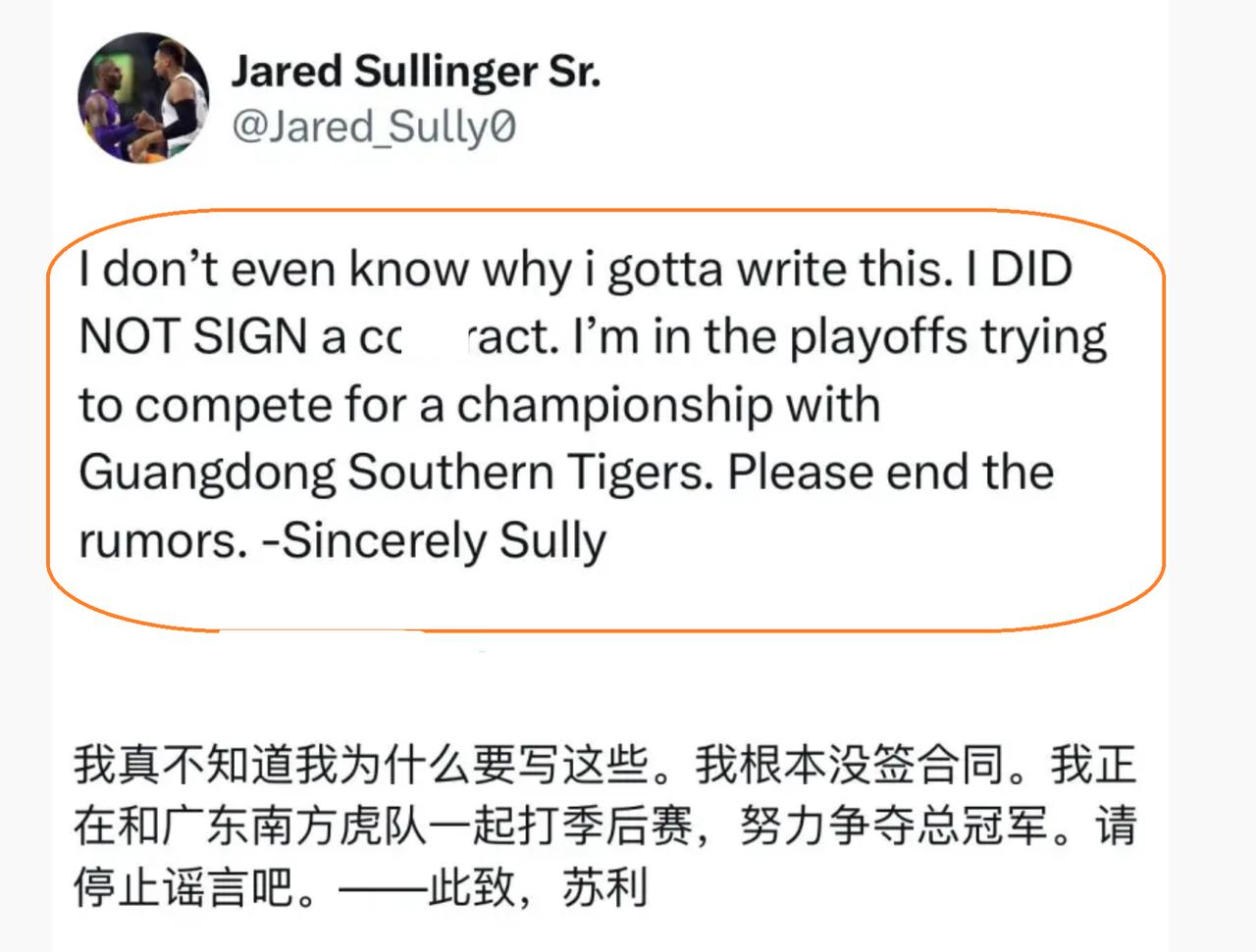 萨林杰是这样写道:我真的不知道,为何要写这样的东西,我完全没有与其他球队签合同,我正在参加CBA季后赛,我要帮助广东队夺取CBA总冠军!请停止这样的造谣,停止这样的谣言吧!