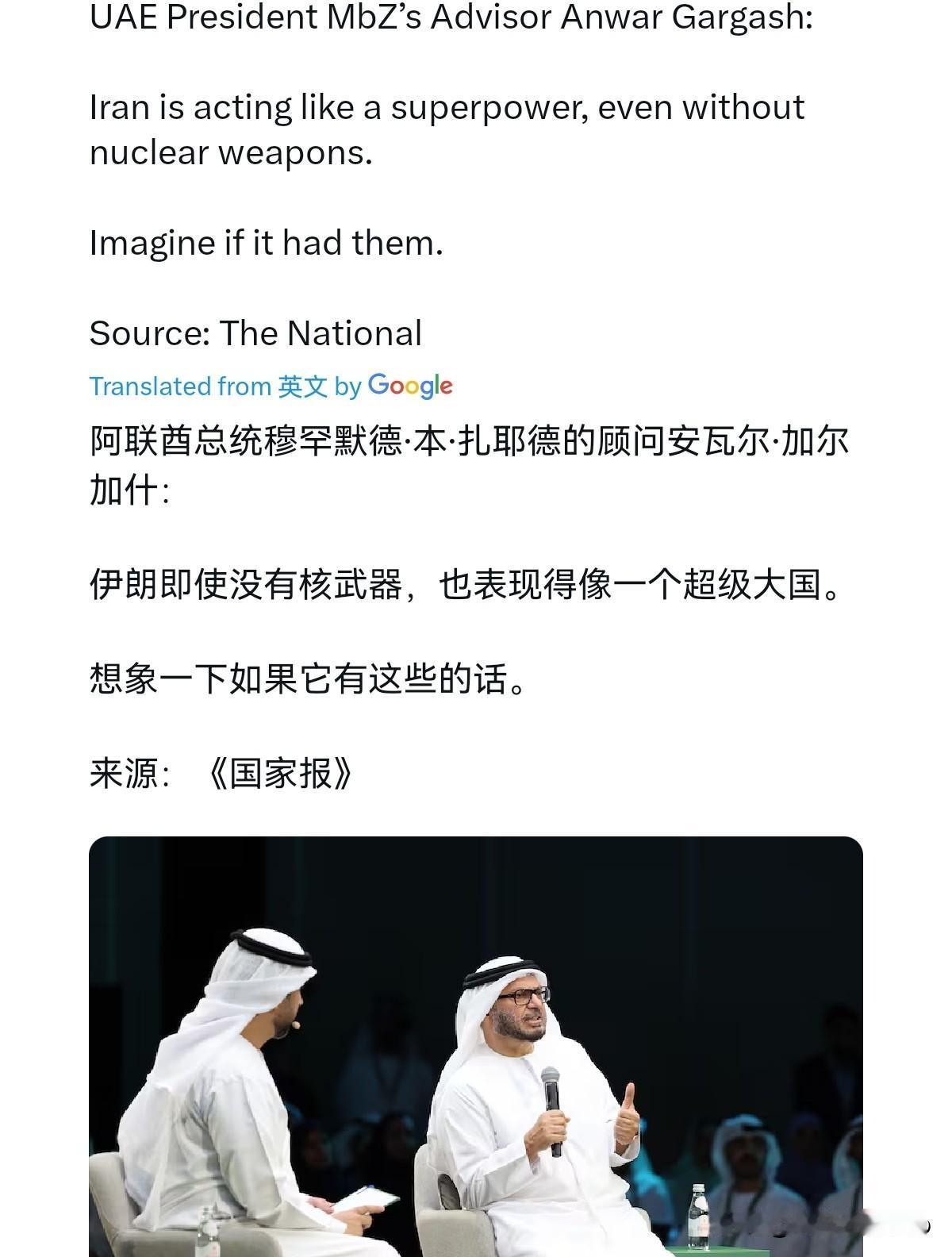 伊朗把阿联酋炸出阴影了!阿联酋总统顾问表示,伊朗行事风格如同超级大国!4月27日,根据外媒报道,阿联酋总统顾问安瓦尔·加尔加什表示:伊朗即便没有核武器,行事作风已然如同超级大国。试想,倘若其拥有核武,后果不堪设想。很显然,阿联酋的这一番话,这说明在阿联酋眼中,伊朗的军事表现大大超出了阿联酋的想象。