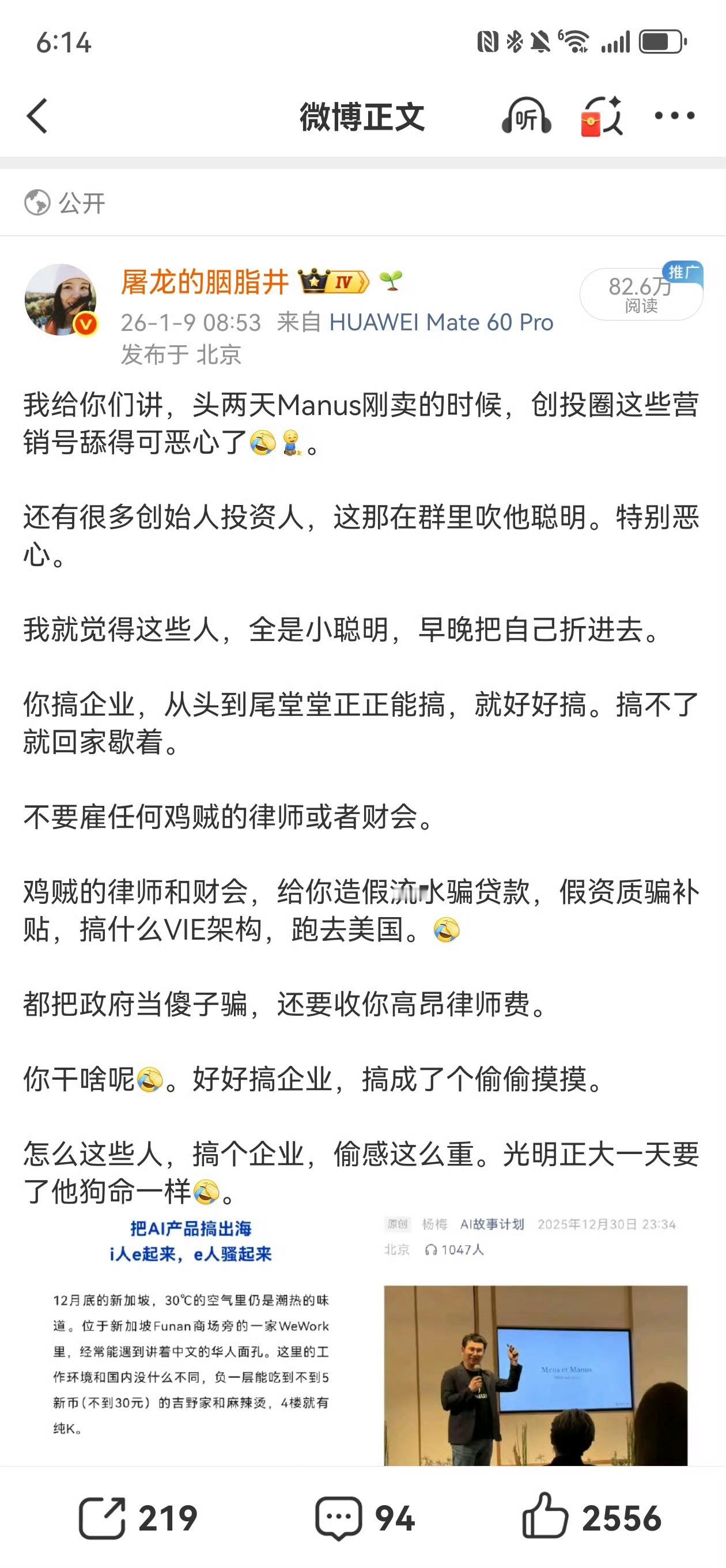 - 长期:要看技术能不能持续领先,如果被竞品追上,又没大靠山,大概率会被边缘化或低价卖掉。一句话总结:中国这波既守住了科技安全底线,又立了新规矩;Manus想“两头通吃”翻车了,钱没拿到、名声受损、未来更难。manus