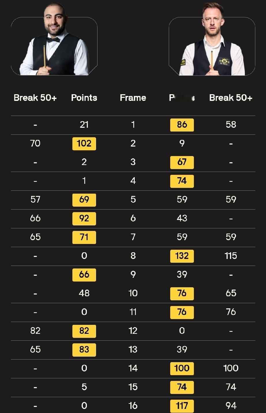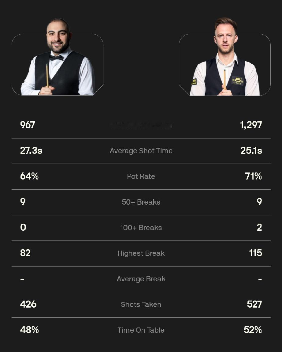 前22局,非种子选手侯赛因瓦菲发挥出色,打出9杆50+,小特打出两杆破百9杆50+,大比分11-11战平。