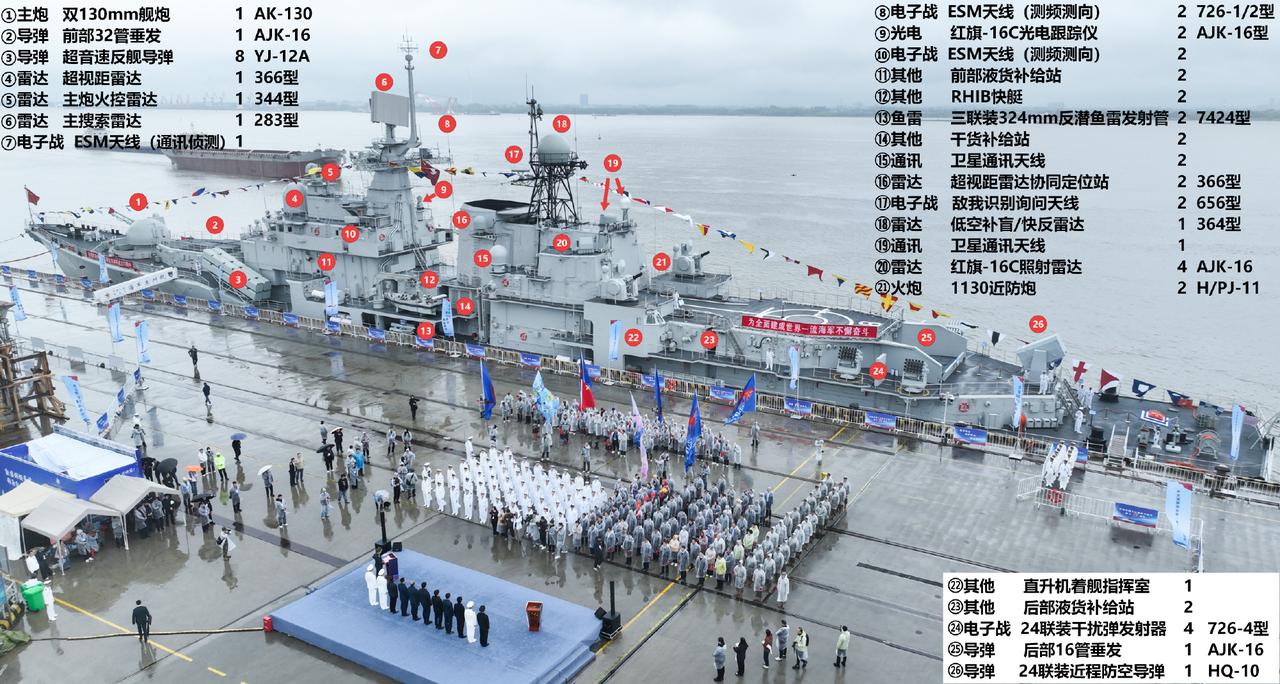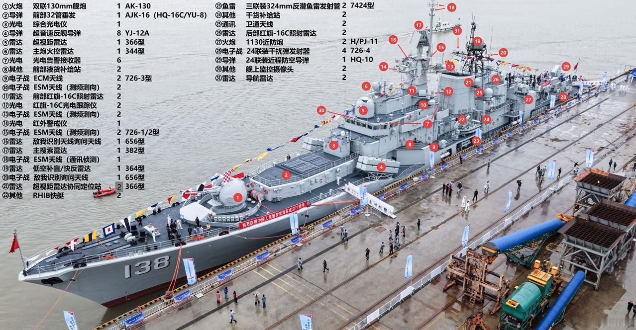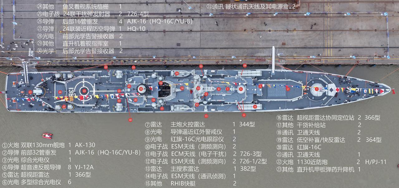 现代化改进之后的现代级驱逐舰参加了海军开放日,GTW拿到高清大图之后,将全舰的武器装备的电子设备进行了标注,非常全面,非常的TW。但是工作做的还不够仔细,比如130主炮的火控雷达,标识为344雷达,这都2026年了,哪里还有344这个型号呢!还有,建议GTW可以将设备的生产厂标注出来,便于避雷。
