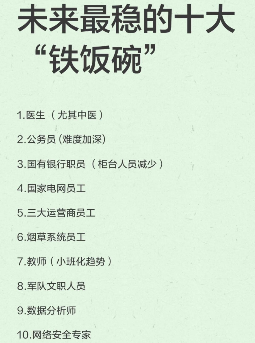 看到这个未来最稳的十大铁饭碗排名,我忍不住笑了。别的不说,据我所知,第七位的教师已经不是铁饭碗了,有的地方有去学校招生人数急剧减少,有老师无书可教,已经开始分流了。前段时间还看到一个新闻,由于现在高中选理科的学生比重越来越大,有一所高中的历史老师很多都没有书教了,当然,目前工资还是有的。如果说教师是以后最稳的铁饭碗,恐怕不一定,要随时有准备到其他行业去工作的准备。