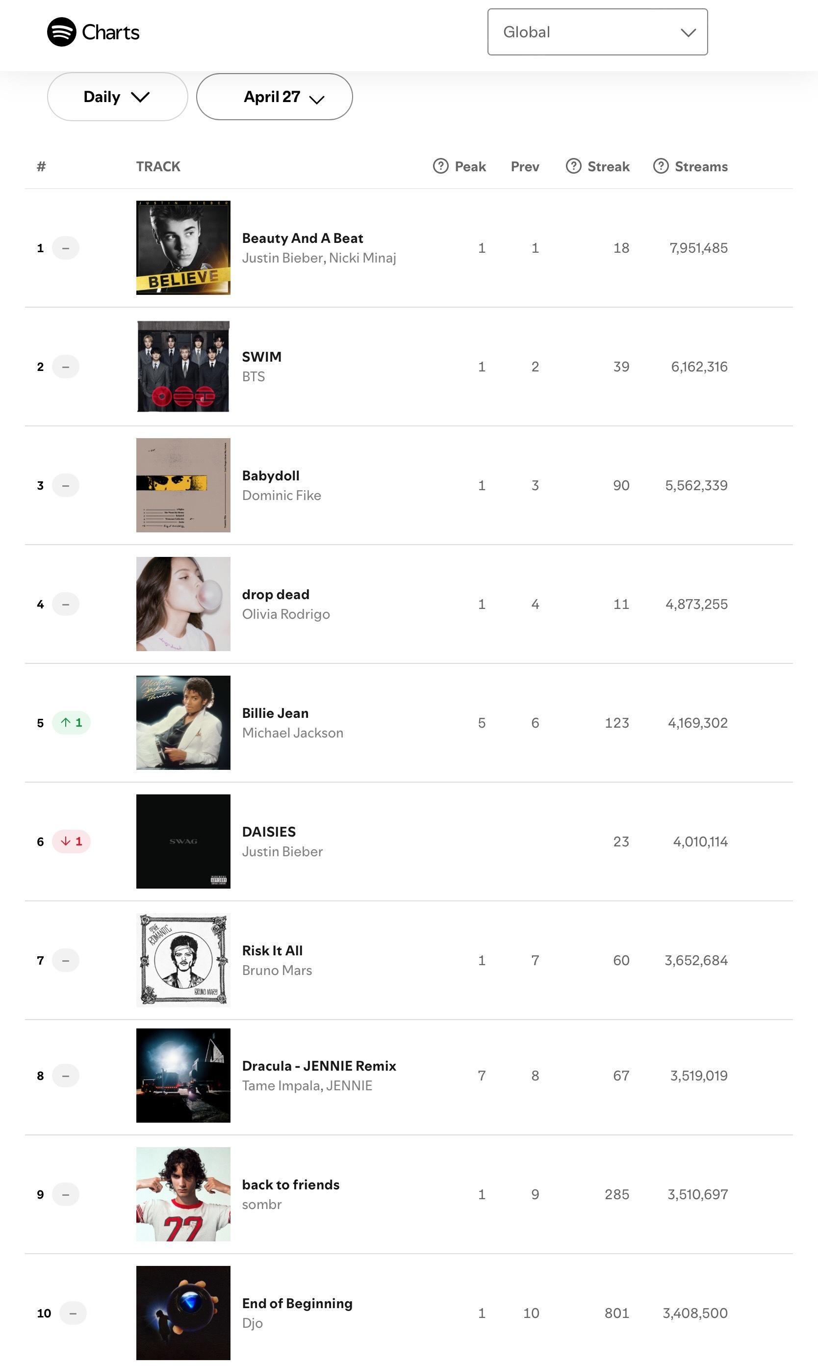 【流媒速览】Spotify 全球/美区歌曲日榜(2026.04.27):