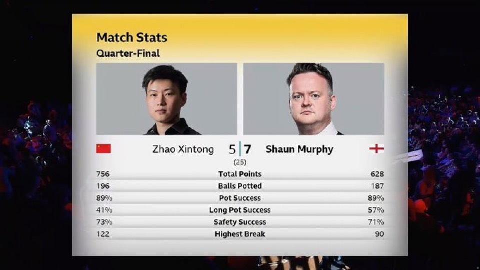 2026斯诺克世锦赛世锦赛凌晨两点场次两桌第二阶段中场短休比分:墨菲7-5赵心童
