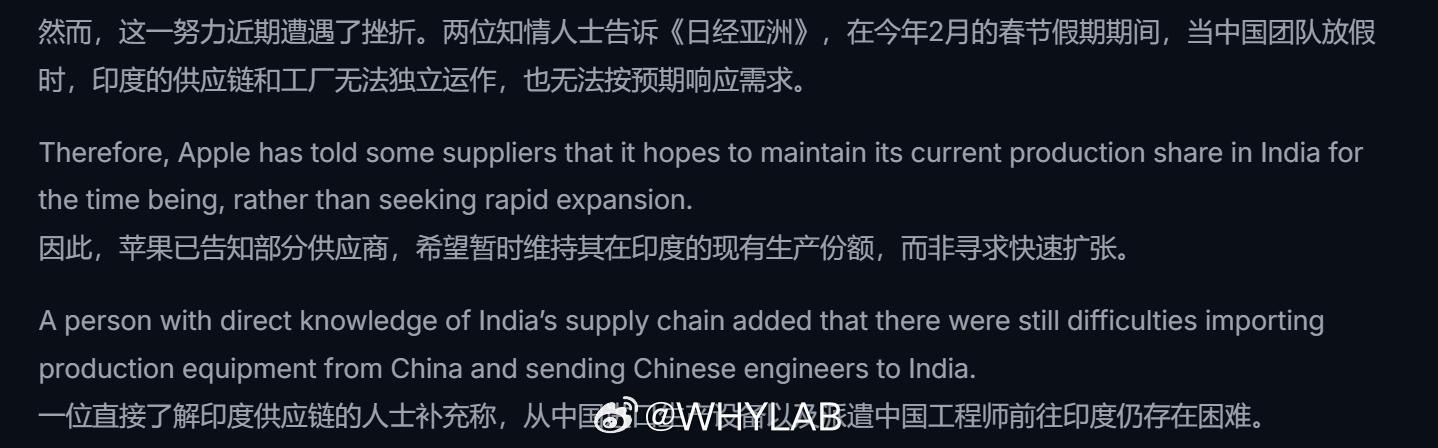 苹果在印度的供应链有点不靠谱呀,《日经亚洲》透露,在今年 2 月中国春节假期期间,当中国团队休假时,印度的供应链和工厂无法独立运作,也无法按预期响应要求。