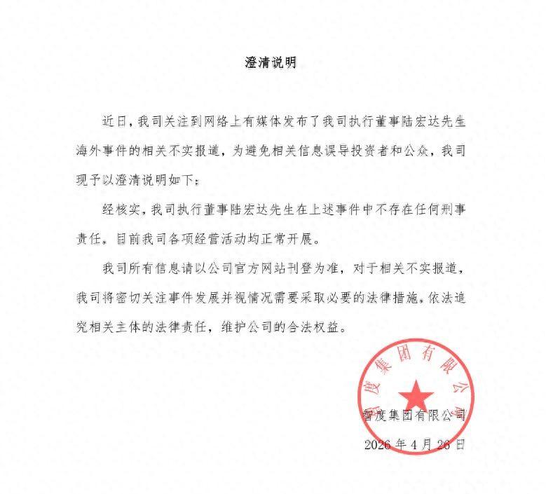 智度集团事后发了个声明,说陆宏达在这起“海外事件”中“不存在任何刑事责任”。但你细品——声明没否认事件本身的存在,也没说他没有民事纠纷。这种“澄清”,说白了就是文字游戏。