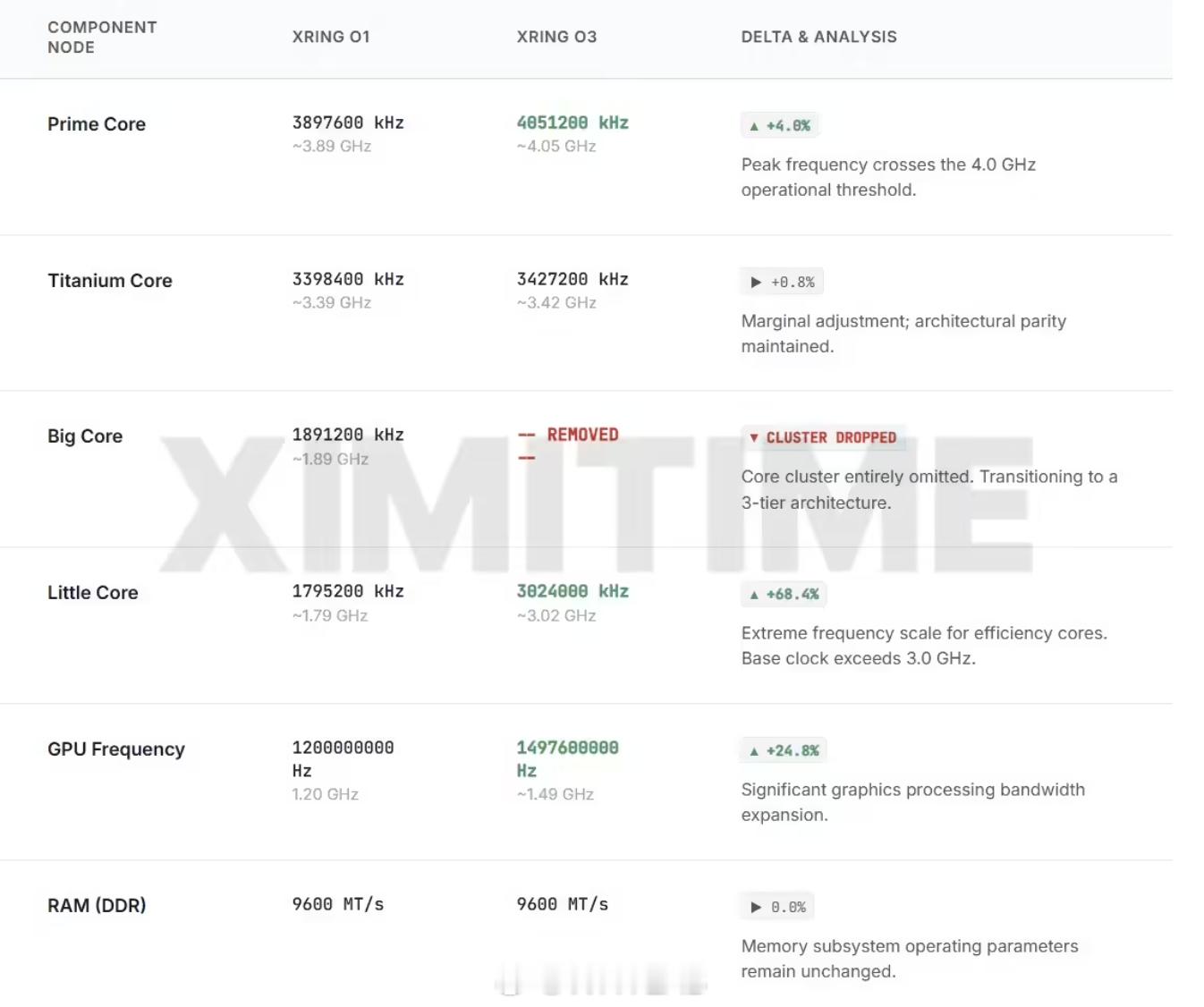 小米玄戒O3曝光外媒 XIMITIME 爆料,玄戒 O3(代号 lhasa)现身 Mi Code 数据库,直接跳过了 O2 命名,从上代 4 集群简化为 3 集群架构,架构精简了,Prime 超大核主频 4.05GHz,Titanium 性能大核 3.42GHz,Little 小核 3.02GHz。