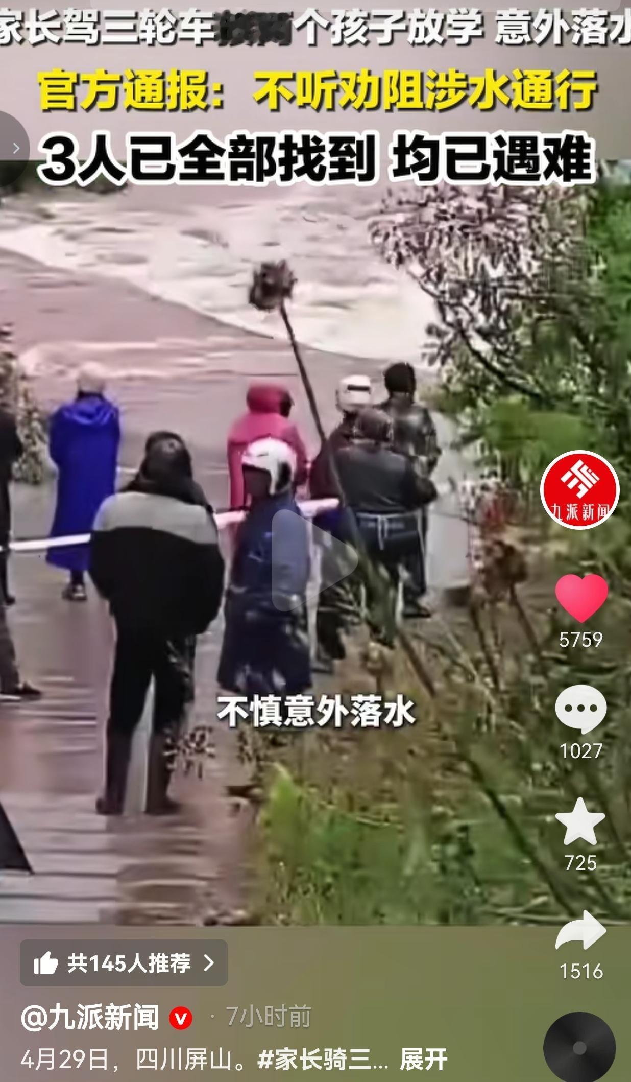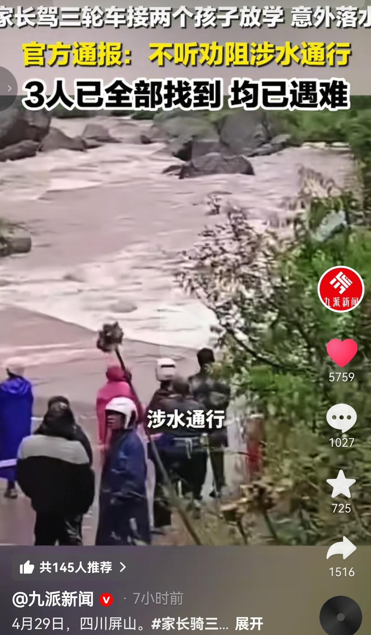 没想到刚驶入漫水区没多远,湍急的水流瞬间就把三轮车冲得失控翻车,父子三人当场被河水卷走。