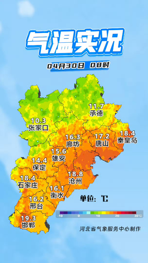 【气温实况】根据国家气象站观测数据统计,今日8时,我省北部地区气温较低,张家口崇礼最低为6.3℃;中南部气温多在14~20℃之间,秦皇岛昌黎最高达20.0℃。和昨日同时刻相比,北部及东部地区普遍升温,其中张家口尚义升幅最大为6.0℃;保定满城降幅最大为2.6℃,中部地区气温变化较小。河北晴暖相伴迎假期河北五一晴为主注意防风防火熬过今天就是五一(河北天气)