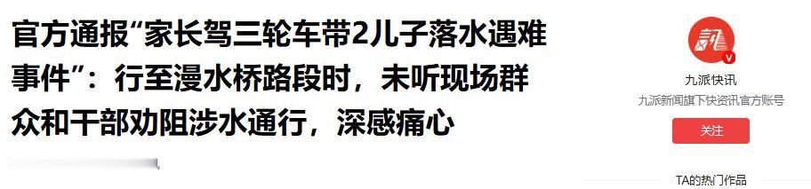 (主要信源:原文登载于九派快讯 2026-04-29 21:08 关于“官方通报“家长驾三轮车带2儿子落水遇难事件”:行至漫水桥路段时,未听现场群众和干部劝阻涉水通行,深感痛心”的报道)