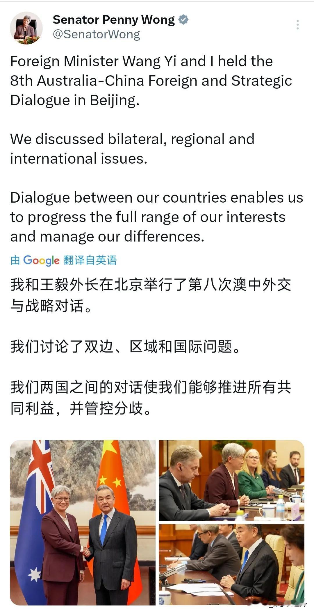 4月29日,澳大利亚外长黄英贤在北京同王毅举行第八次澳中外交与战略对话。会后黄英贤对外表示,双方深入磋商双边、区域及国际议题,通过常态化对话机制,既能务实推进彼此共同利益,也能妥善管控好双方分歧。