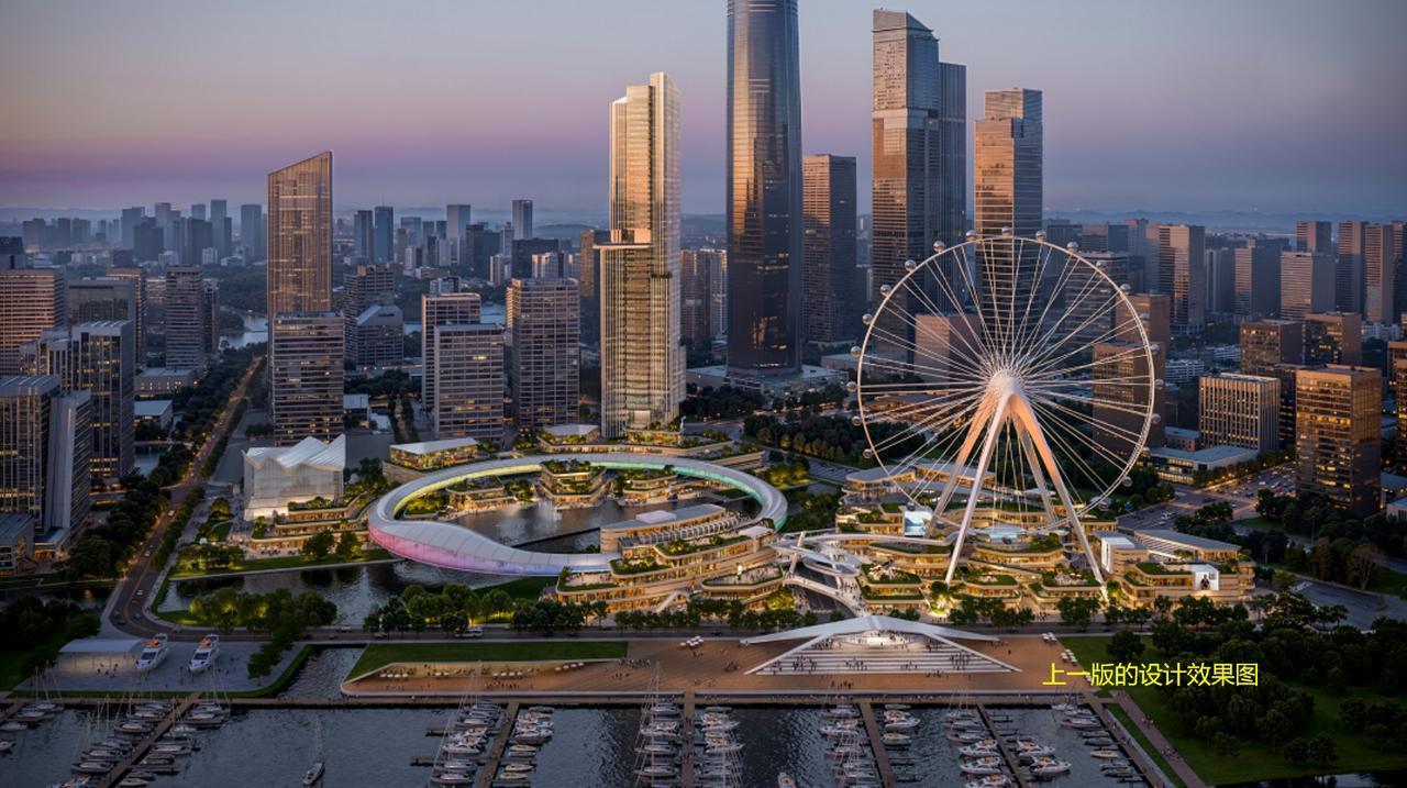 这次新版效果图最大的变化是在摩天轮下面的综合体上。可以看到对比上一个版本,这的版本应该是进行了简化大砍,上一个版本综合体方面应该是有好多层次的,有点类似邮轮母港城悦天地的那种设计。而这次的新方案则简化成了各自独立单独建筑。