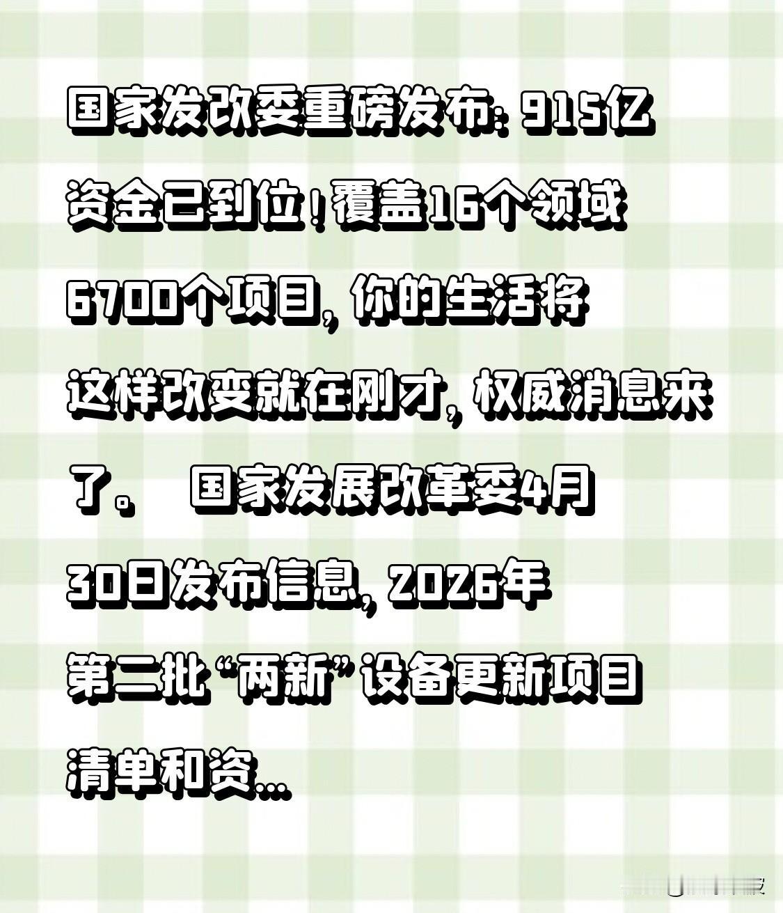 国家发展改革委4月30日发布信息,2026年第二批“两新”设备更新项目清单和资金安排已经正式下达,本次资金规模高达915亿元。