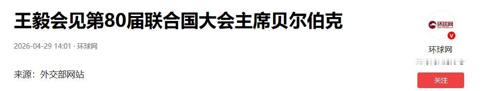 信息来源:王毅会见第80届联合国大会主席贝尔伯克 2026-04-29 14:01·环球网