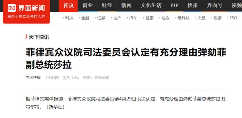 菲律宾众议院司法委员会 4 月 29 日表决,认定弹劾她的理由充分。