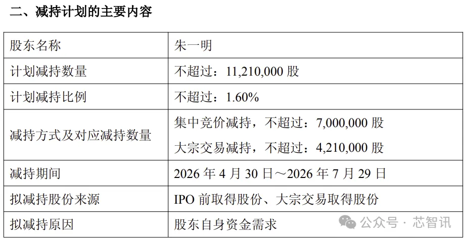 公告还显示,朱一明本次拟减持股份来源为IPO前取得股份及大宗交易取得股份。减持期间为2026年4月30日至2026年7月29日。若上市公司有送股、资本公积金转增股本、配股、回购注销等事项,上述拟减持股份数量、股权比例将相应进行调整。