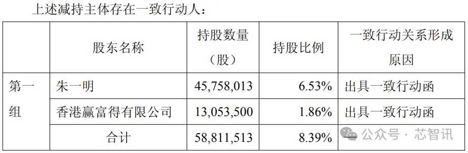 截至此次公告披露日,朱一明直接持有兆易创新股份4575.8万股,约占公司总股本的6.53%;其一致行动人香港赢富得有限公司持有公司股份1305.35万股,约占公司总股本的1.86%。两者合计持股5881.15万股,合计持股比例为8.39%。