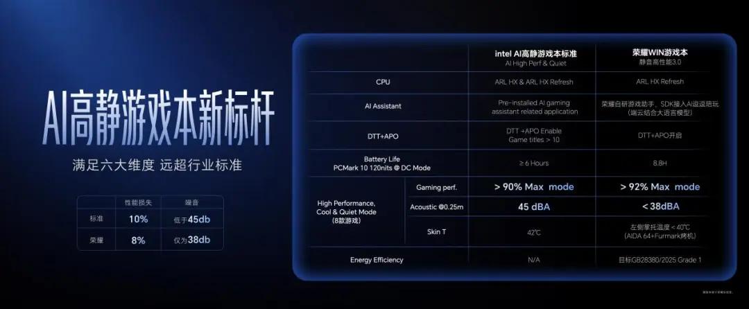 官方表示,荣耀将风扇马达尺寸控制在10mm以内,同时转速维持在20000RPM以上,整机风量较传统内吹方案提升10%,因此可以实现至高270W满血功率释放,配合5070Ti显卡,能全程稳定运行大型3A游戏。