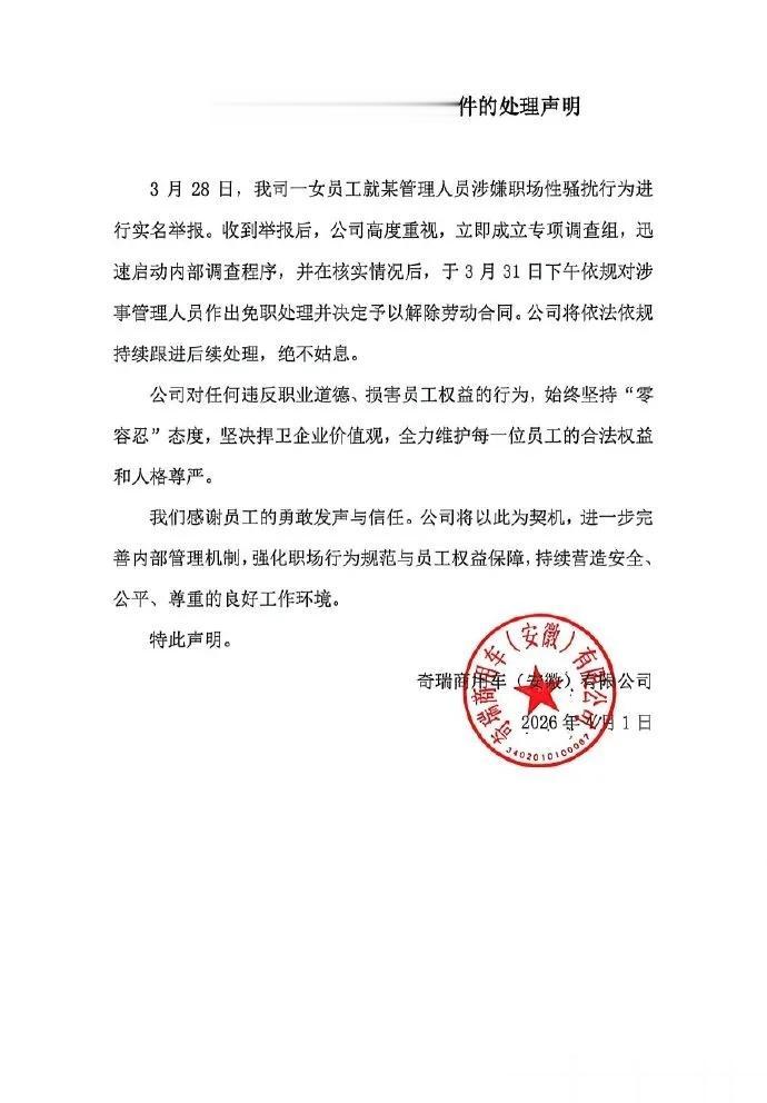 4月1日,奇瑞商用车(安徽)有限公司就女员工实名举报管理人员职场性骚扰一事发布官方声明。