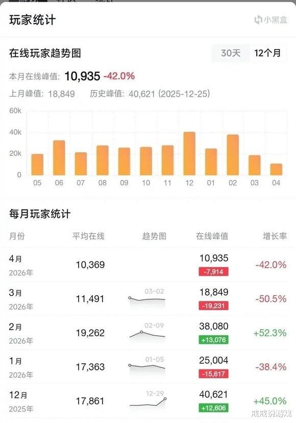 其实之前版本长草期也没这么离谱过,这回是真兜不住了。3月份增长率-50%,创下了历史玩家流失量最高纪录。更惨的是4月份,按以前规律大流失之后一般会回流一点,结果4月份不仅没涨还继续-42%。连跌两个月不带喘气的,放在几个月前完全不敢想象,那时候鸣潮还欣欣向荣,某音刷到的全是千咲的二创视频。
