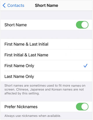 如果在拨打电话时已保存的联系人未显示在 iPhone 上,则“简称”功能可能会以不同的方式显示姓名或将其完全隐藏。因此,您可以关闭该功能,看看它是否能解决联系人未显示在 iPhone 上的问题。