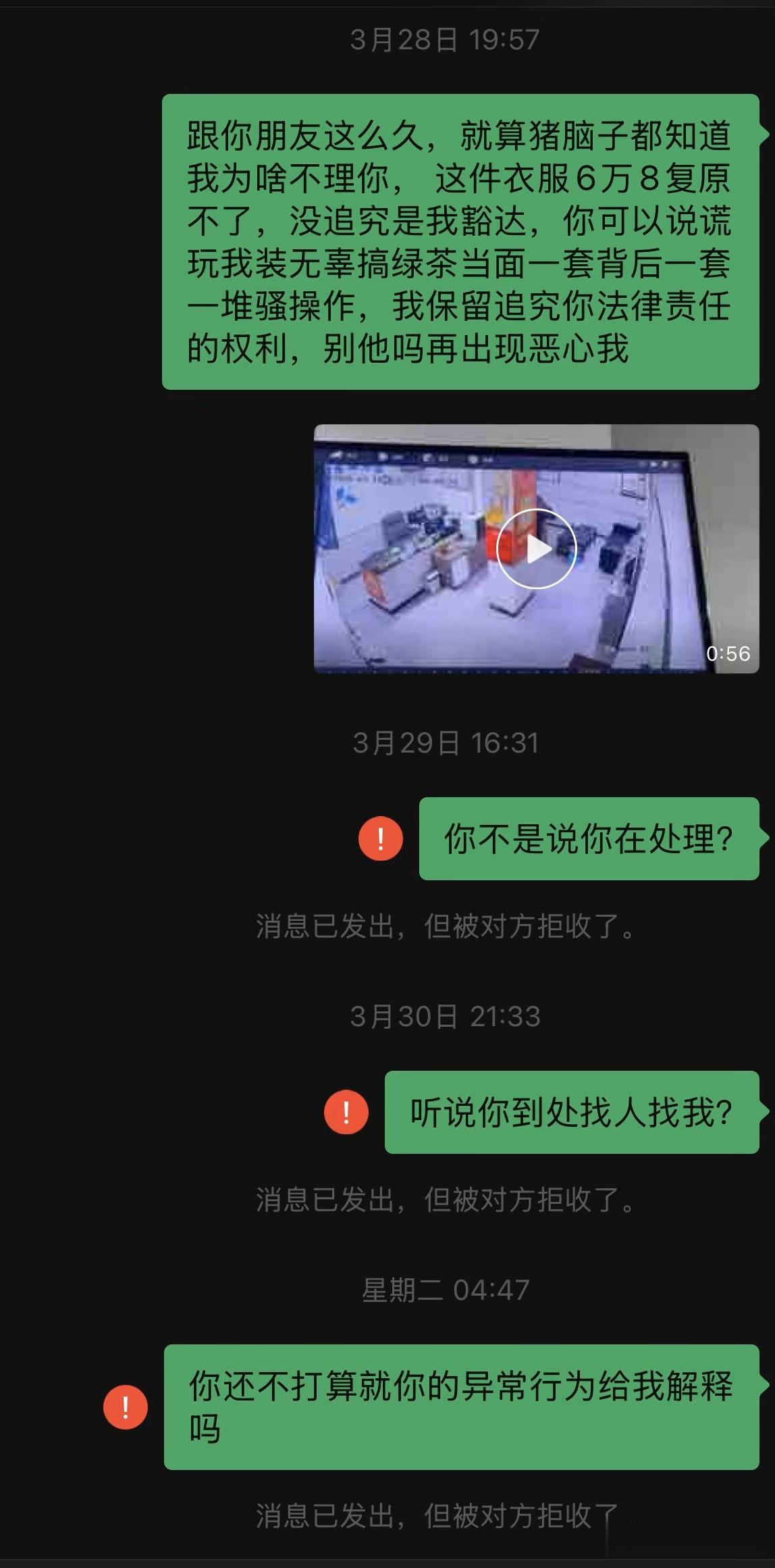 当张女士看完监控后气着手发抖,并把这段监控发给周某称: “没追究是我豁达!”