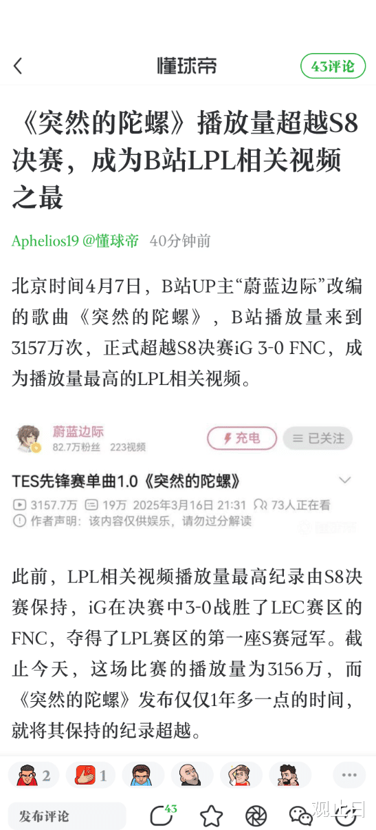 2026年4月7日,B站一则数据引发热议:UP主“蔚蓝边际”创作的二创歌曲《突然的陀螺》播放量突破3158万,正式超越S8全球总决赛决赛iG vs FNC(3156万),成为B站播放量最高的LPL相关视频。