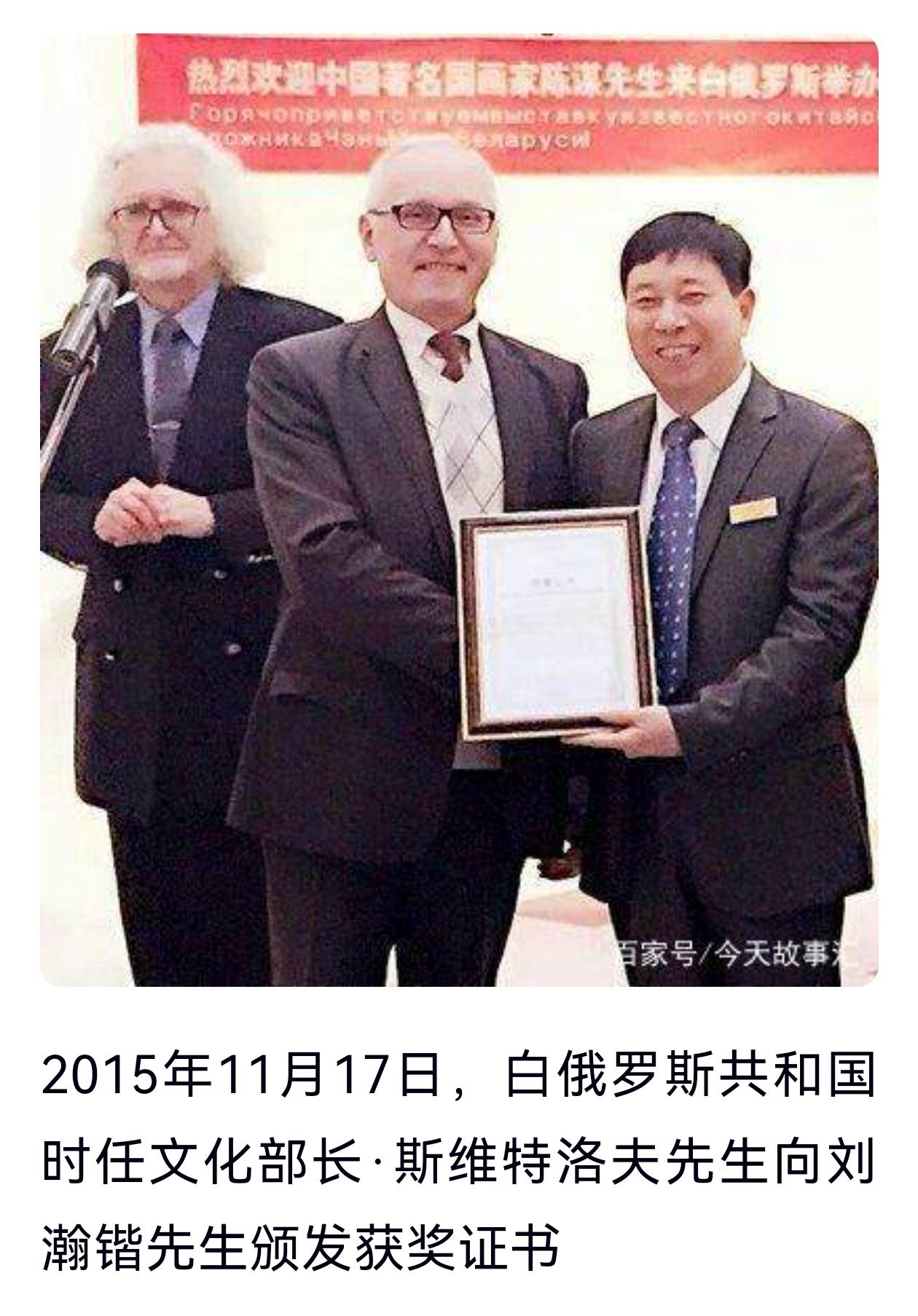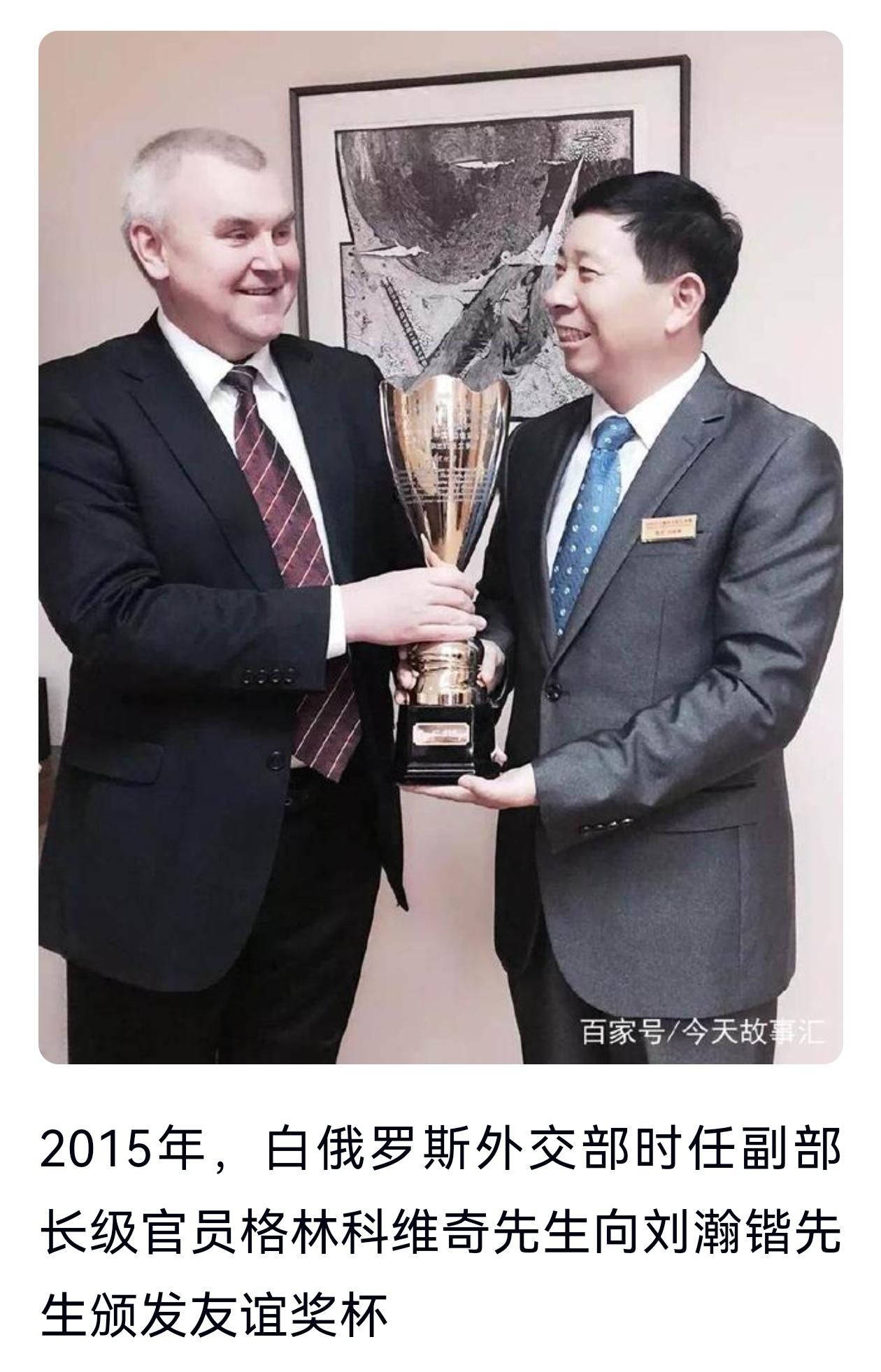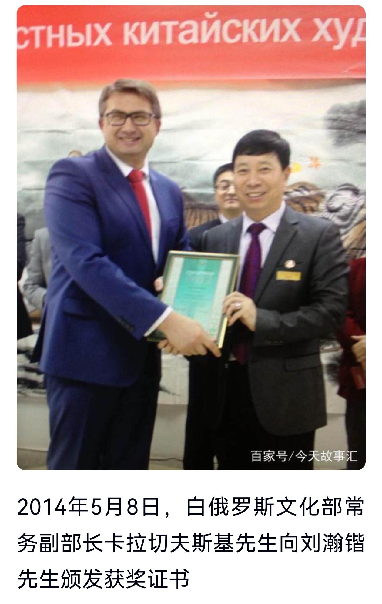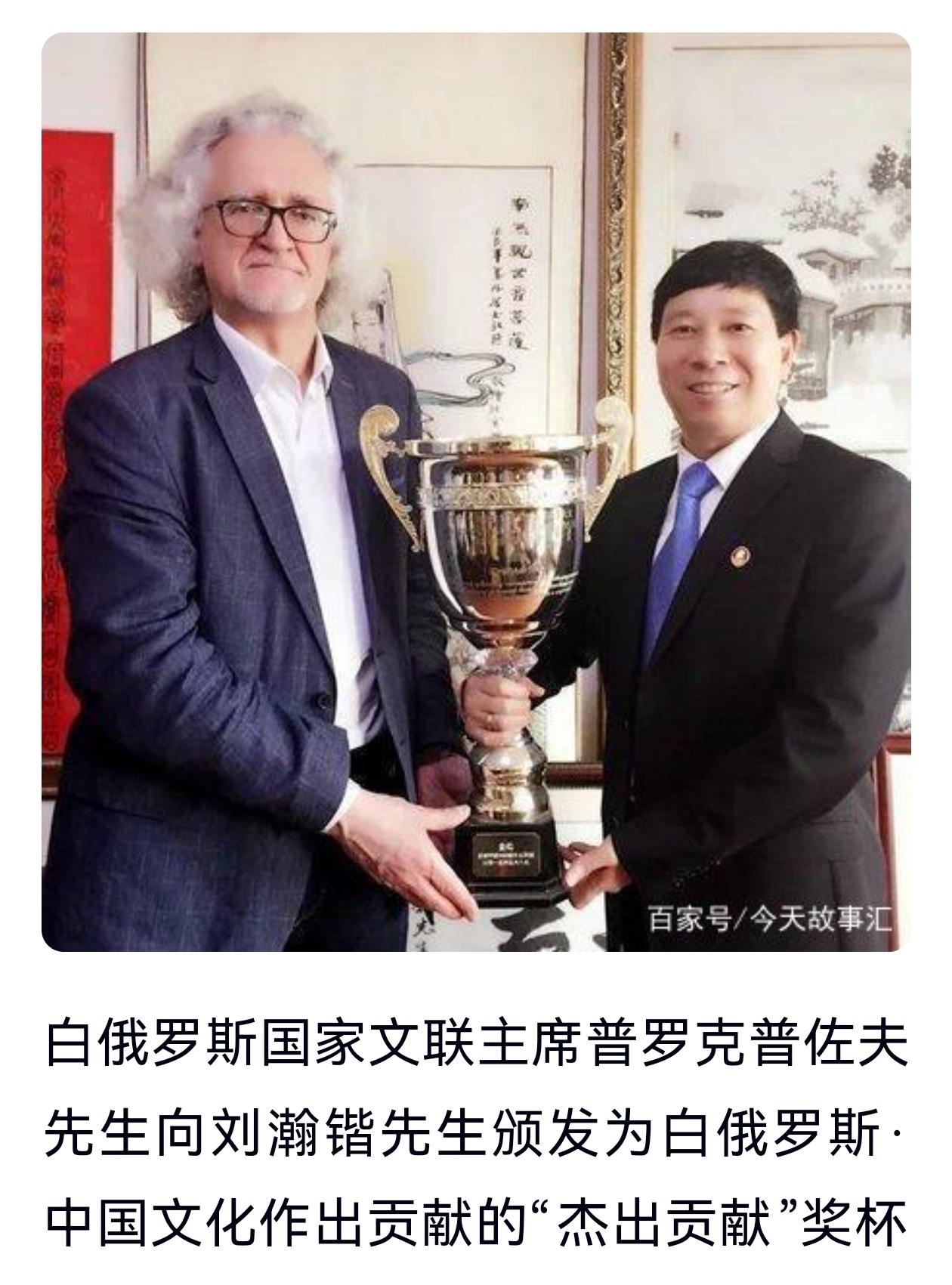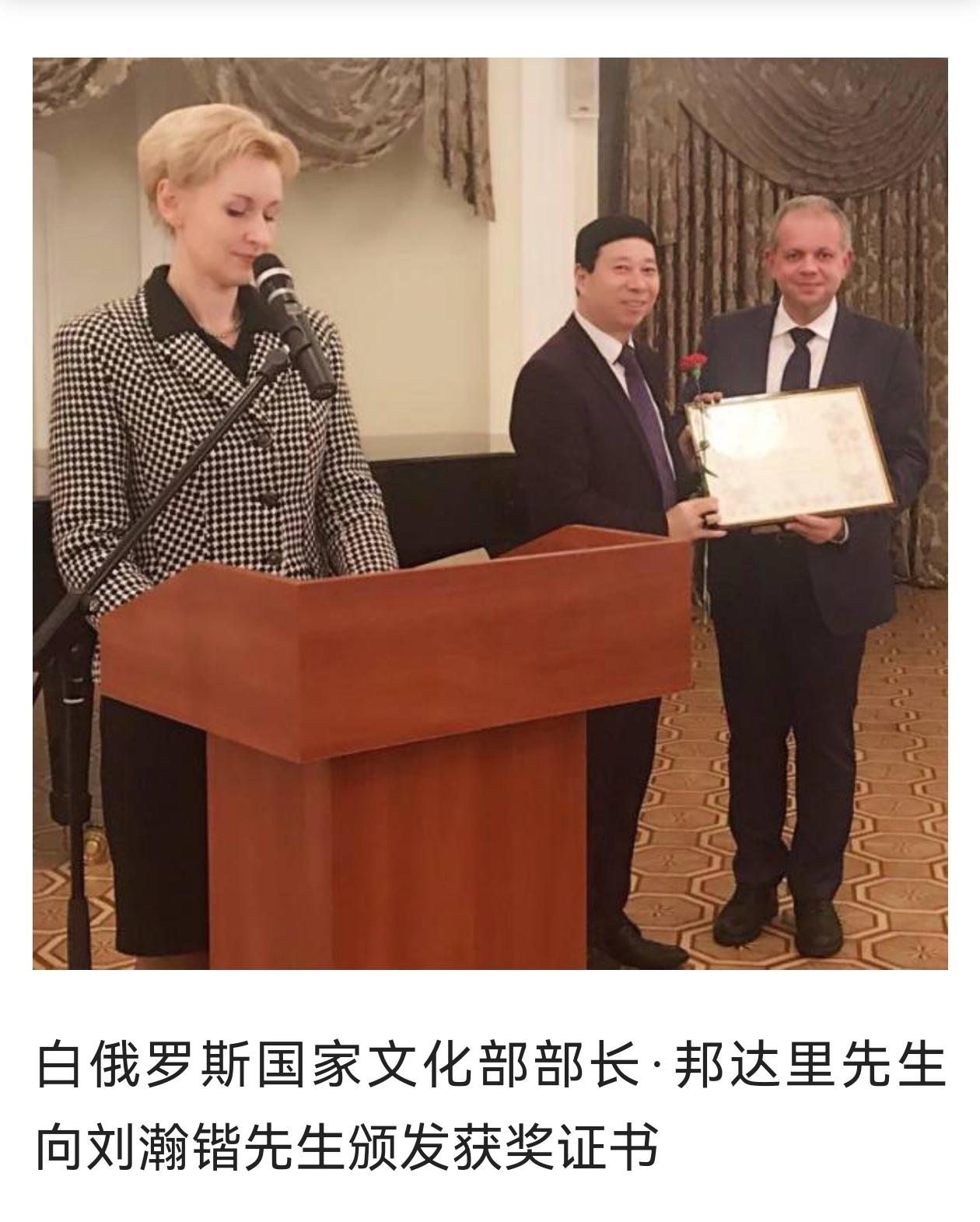 刘瀚锴多年的艰辛付出,得到白俄罗斯国家高层的高度认可。白俄罗斯国家三任文化部部长、外交部副部长及广电总局领导,都曾亲自为他颁发白中文化交流、白中友好重要贡献奖和卓越贡献奖杯。从早期民间对接、高层会面,到官方机构合作、正式授职,刘瀚锴以十余年坚守,完成了从文化爱好者到中白文化使者的身份蜕变,为两国友谊与民间友好筑牢根基。