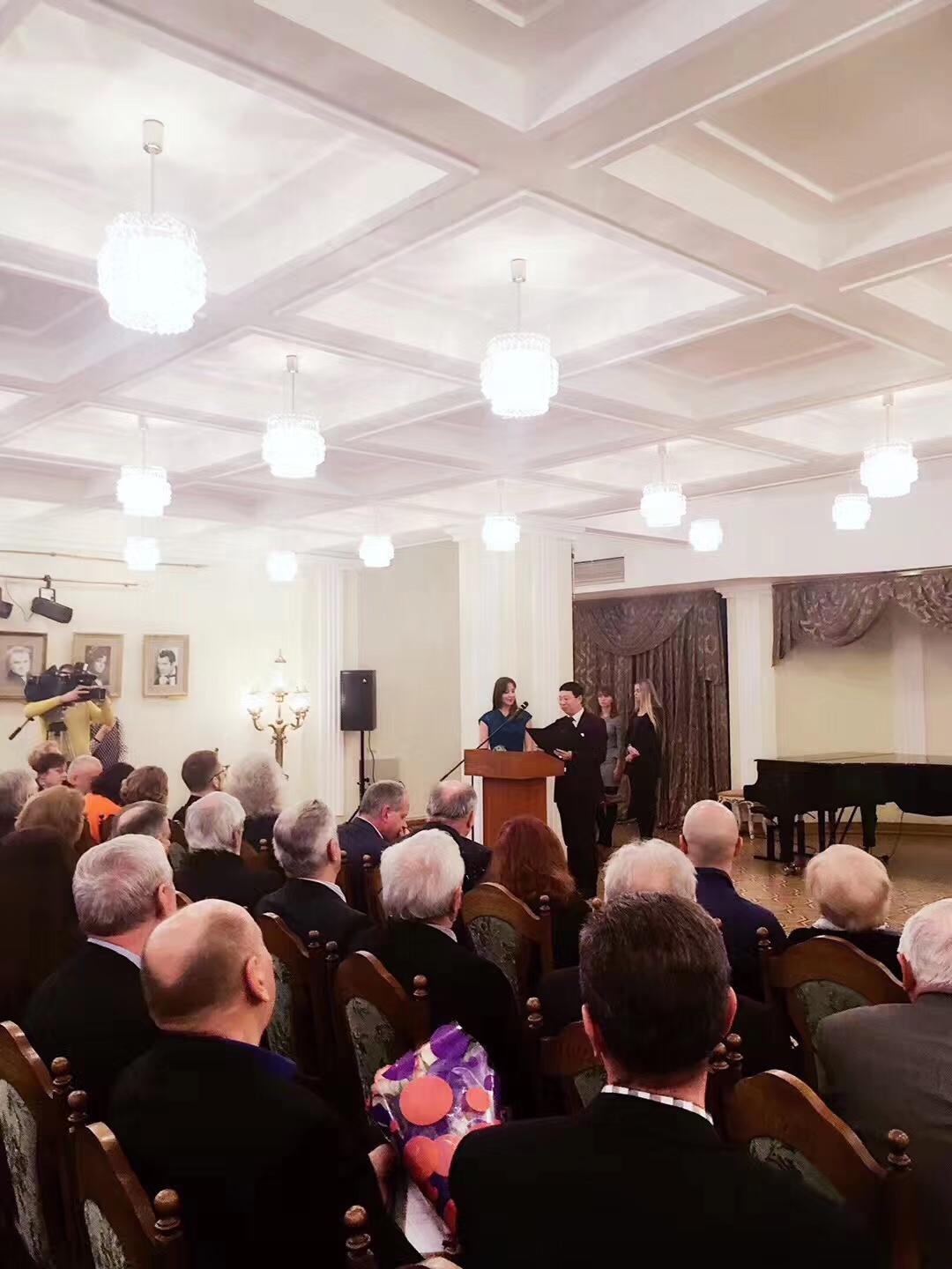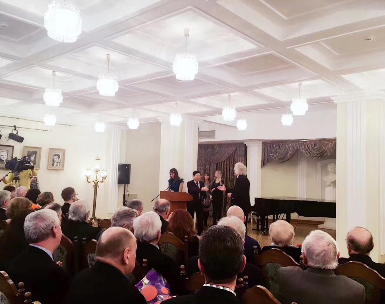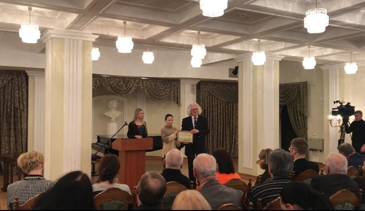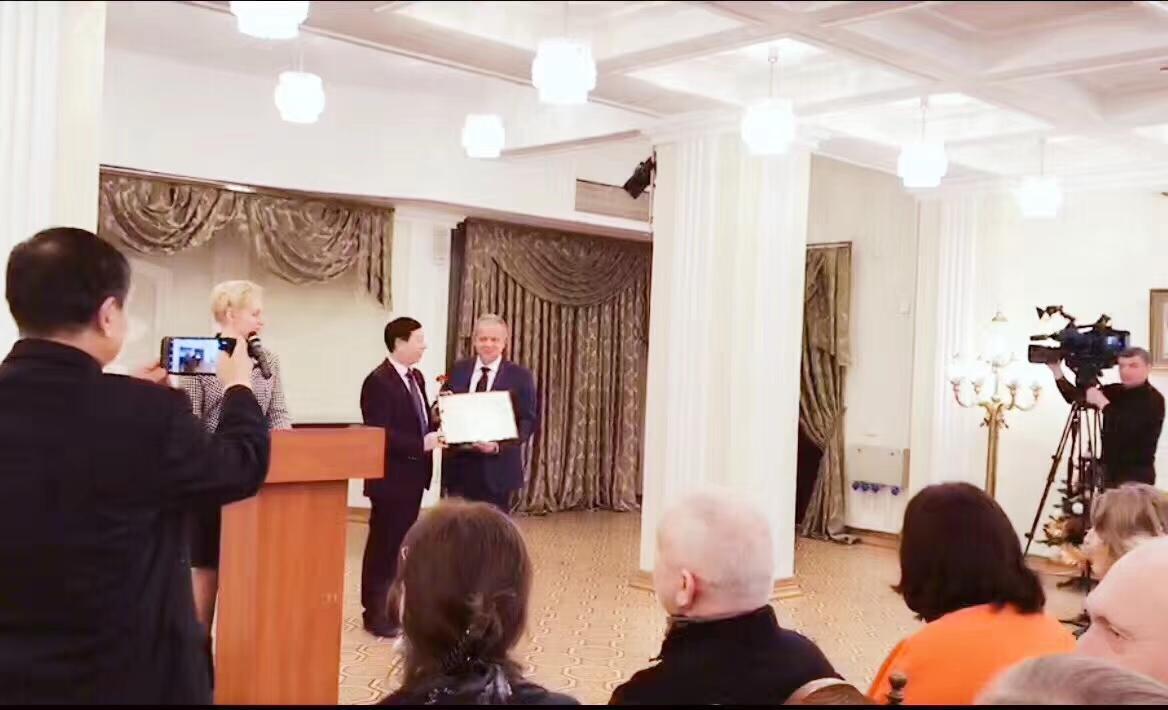 白俄罗斯国家文联主席普佐夫向著名青年歌唱家韩旭颁发白俄罗斯国家文联授予的“百灵之声”荣誉称号