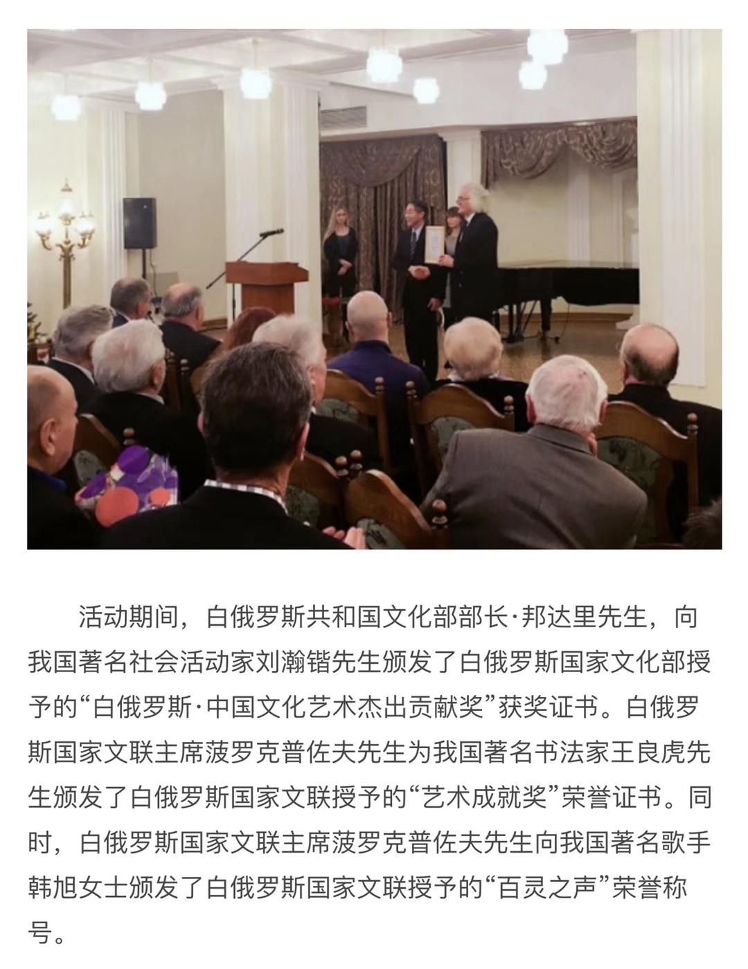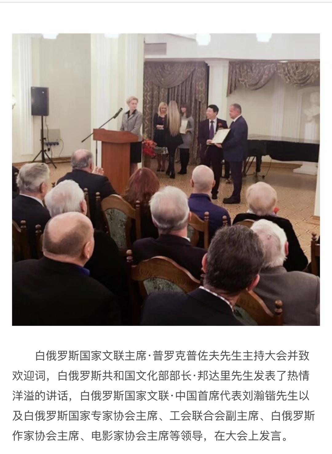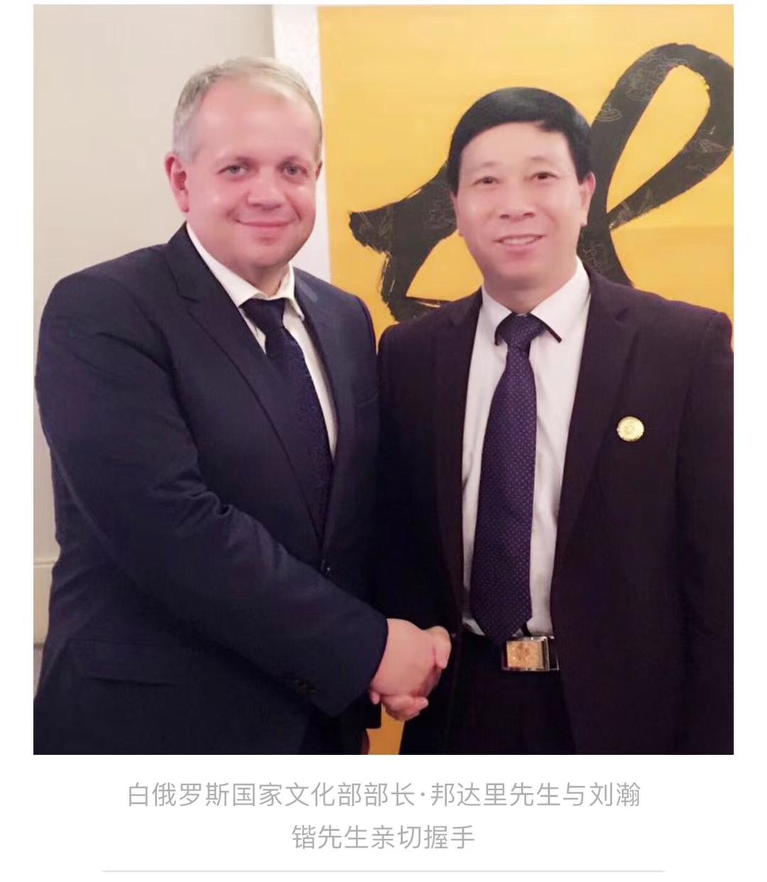 2017年,恰逢中白建交25周年,应白俄罗斯国家文联邀请,刘瀚锴先生率团赴白进行为期8天的正式访问,出席12月12日下午在明斯克举办的白俄罗斯国家文联成立25周年庆典活动,多位白俄罗斯高层领导出席会议。联合国教科文组织代表、白俄罗斯国家文联主席普罗科普佐夫先生,特邀刘瀚锴首席代表宣读中国文联的贺信,我国著名青年歌唱家韩旭老师、著名书法家王良虎先生等中方嘉宾,与白俄罗斯国家多位文化官员、专家学者共同见证了这一美好时刻。