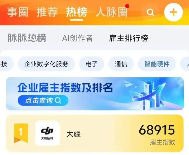 老冀听闻,在2025年的猎头行业,大疆绝对是最受欢迎的客户。一方面,大疆发布的招聘数量很多;另一方面,大疆对于高阶人才的吸引力很大,帮大疆“挖人”的成功率远高于其他公司。今年,大疆的热度还在持续。就在前不久,大疆还曾经攀升至脉脉平台雇主排行榜榜首。
