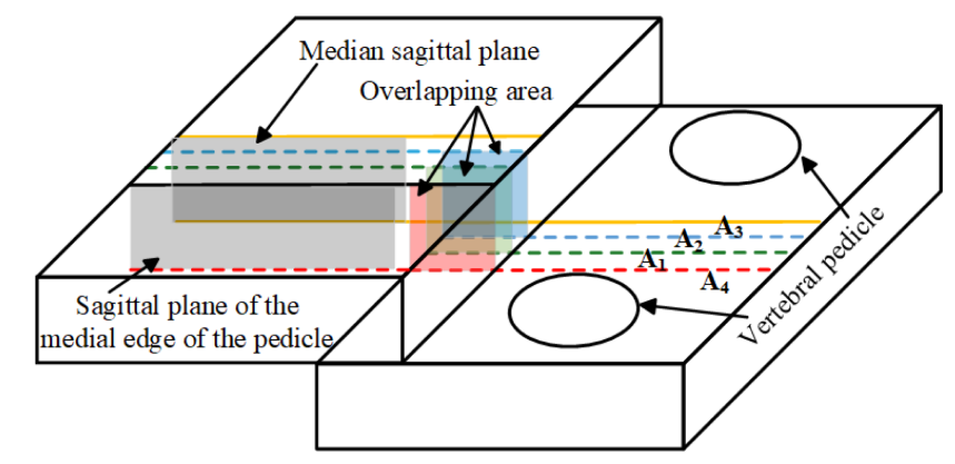 图9 展示了评价区域的划分标准:A1区为外侧三分之一、A2为中间三分之一、A3为内侧三分之一、A4为椎弓根内侧缘外侧区域(对应论文 Fig. 9)。