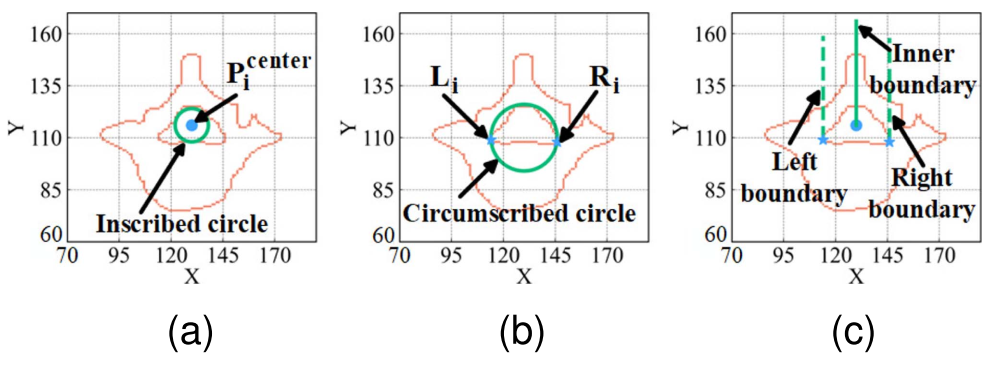 算法的第一步是从CT图像中定位椎板区域。作者利用了一个关键的解剖学关系:椎板与椎管在几何上高度相关。通过找到椎管的最大内切圆和最小外接圆,可以确定椎管中心点、左右椎弓根内侧缘点,进而框定出椎板的大致范围。
