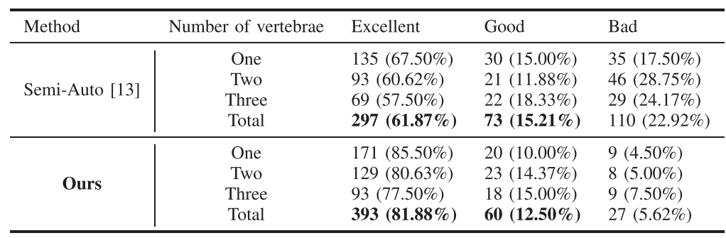 表1 对比了本文方法与半自动方法[13]在不同椎体数量下的优良率。本文方法在单椎体、两椎体、三椎体上的优良率分别为85.50%、80.63%、77.50%,均显著优于半自动方法。