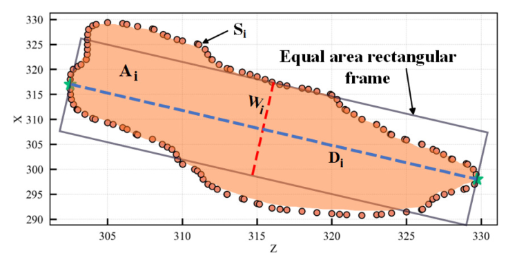 图5直观展示了这个计算:橙色区域为切割轮廓面积,蓝色线为z轴最大距离,红色线为估算的平均厚度。