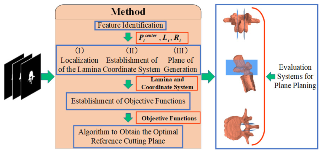 中科院深圳先进院联合多家单位提出了一种基于多目标优化的自动切割平面规划方法。他们不依赖大量标注数据,而是从CT图像中自动提取椎板的几何特征,将切割路径规划转化为一个在可行域内搜索最优切割平面的优化问题。