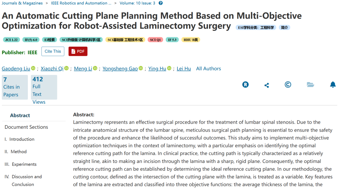 引文格式:Liu G, Qi X, Li M, et al. An automatic cutting plane planning method based on multi-objective optimization for robot-assisted laminectomy surgery[J]. IEEE Robotics and Automation Letters, 2025, 10(3): 2343-2350.
