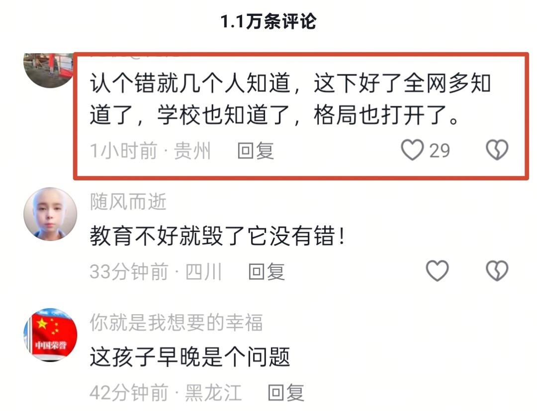 也有网友说: “认个错就几个人知道,这下好了全网都知道了,学校也知道了,格局也打开了。”