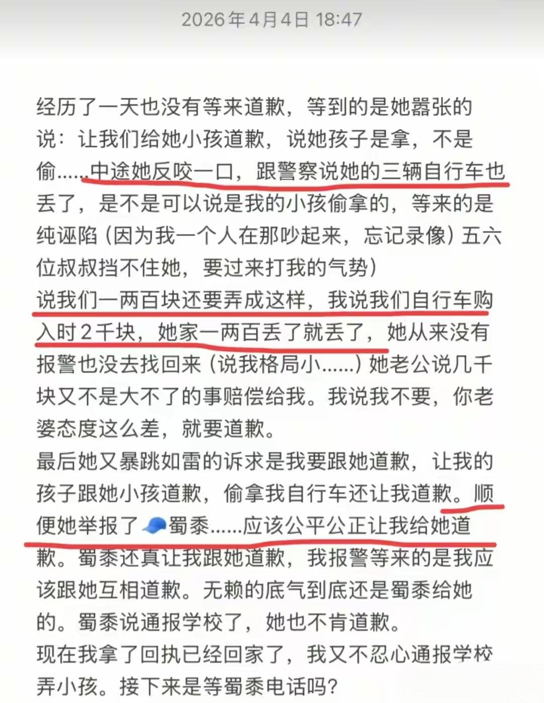 近日,广东一女子发视频称: 自己的自行车被陌生男孩偷骑走了,找到人后,男孩母亲不仅不道歉,反而指着她骂“格局小”,甚至要求她给孩子道歉说“小孩子不懂事,骑一下怎么了?至于这么较真?”