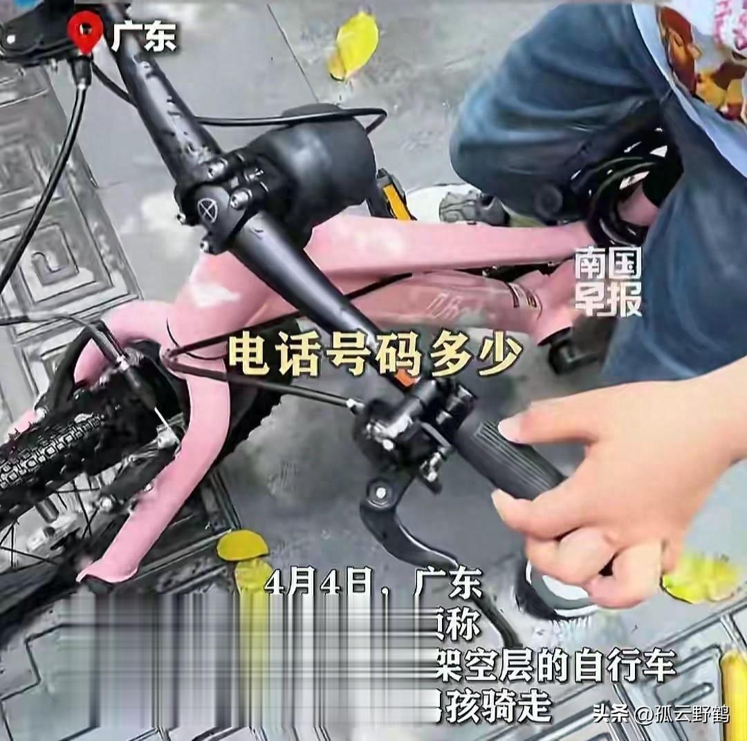 4月4日,广东一女子把粉色小型自行车停在自家单元楼架空层,第二天下楼时发现车子不见了,四处寻找,找了几天在小区另一栋楼看到一个男孩正骑着她的车。