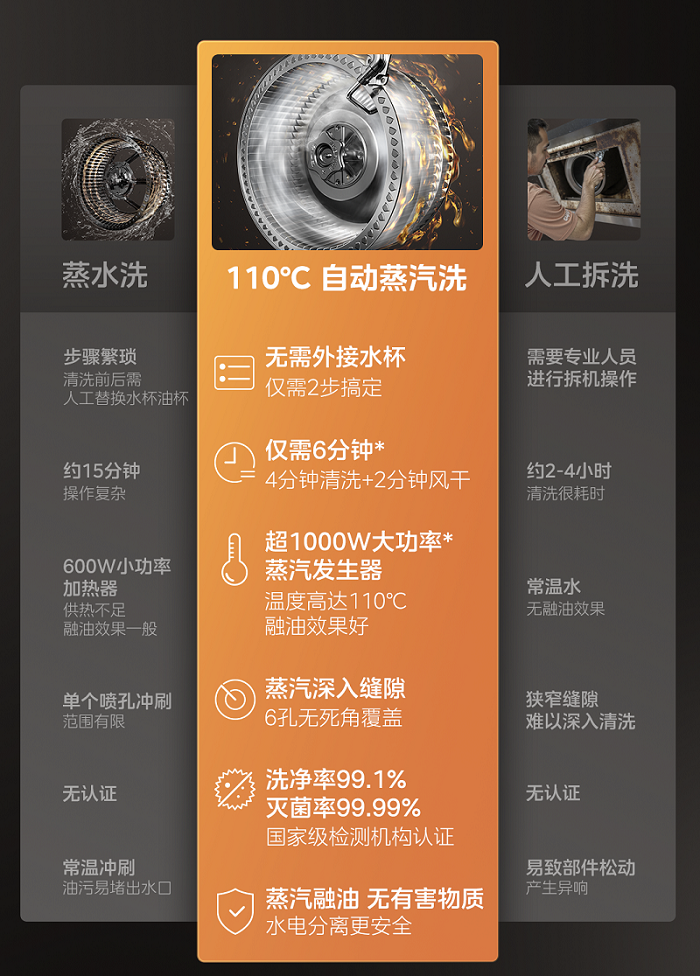 不同于传统油烟机搭载的自清洁功能,美的小西梅油烟机_x0005_模拟深度清洁的黄金法则:先将清洁用水加热成110℃高温蒸汽,蒸汽经由350千帕高压作用喷射而出,内部进行360°无死角冲刷。高温+高压可深度溶解顽固油渍,实现了99.1%的油污洗净率与99.99%的杀菌率,从根源上杜绝了油污堆积对电机和风道的影响。内置专利BMC塑封电机技术,更能通过水电永久分离,来提升用户使用时的安全性。
