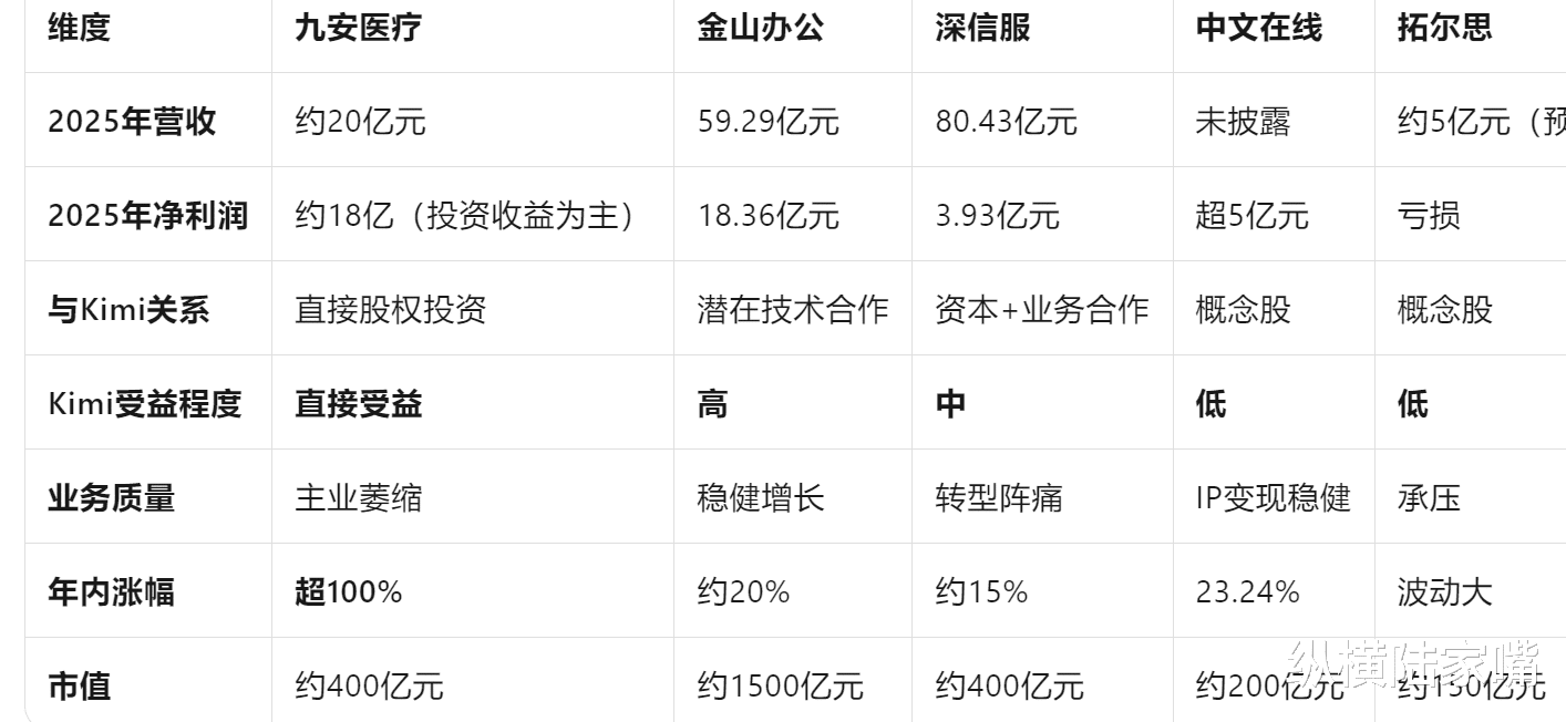 九安医疗的现金和AI医疗布局,深信服的Kimi持股+主业修复,金山办公的AI办公生态,中文在线和拓尔思的烧钱换市场——五家公司五条路,但共同指向一个方向:Kimi这轮爆发,正在重塑中国AI产业的价值链分配。