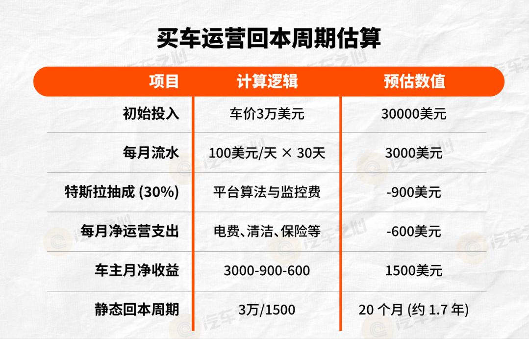 按照每月 3000 美元流水,与必要的清洁、保险、电费等成本测算,车主单月收益可以有 1500 元美金,静态回本周期约 20 个月,不到两年。