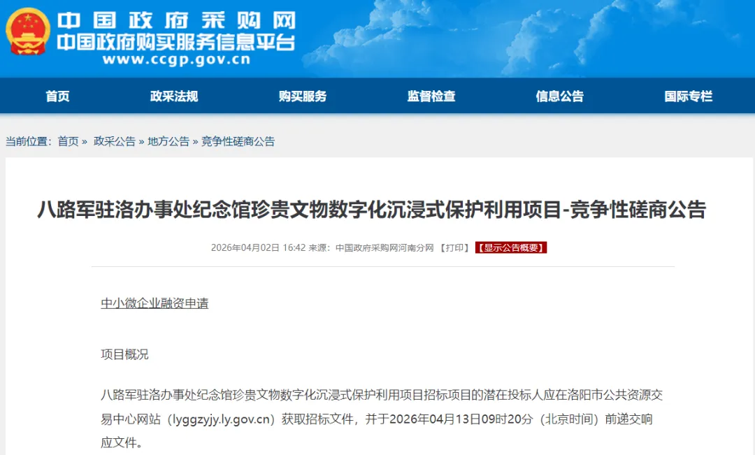 4月2日,中国政府采购网发布了八路军驻洛办事处纪念馆珍贵文物数字化沉浸式保护利用项目的竞争性磋商公告。