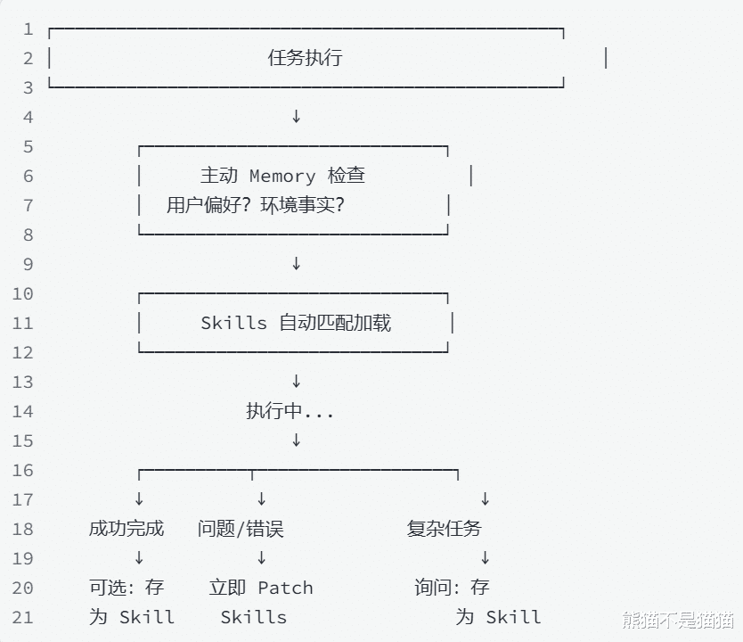 同时对于用户和它在沟通过程中频繁提到的内容,它会主动将其创建为skill,方便任务的复用调用,而不是单纯靠memory来进行存储,内置的mcp_skill_manage会理解用户的任务,用来维护更新现有的skill,而不是一板一眼地固定skill,显得非常死板。