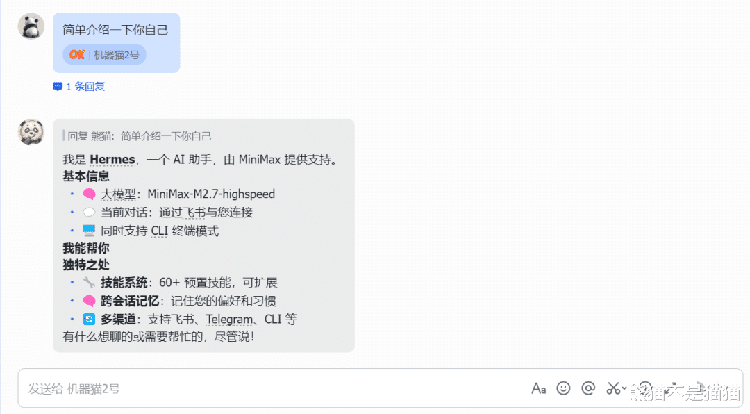到这里一切就配置好了,回到飞书用机器人就可以直接发送消息开始进行任务了。