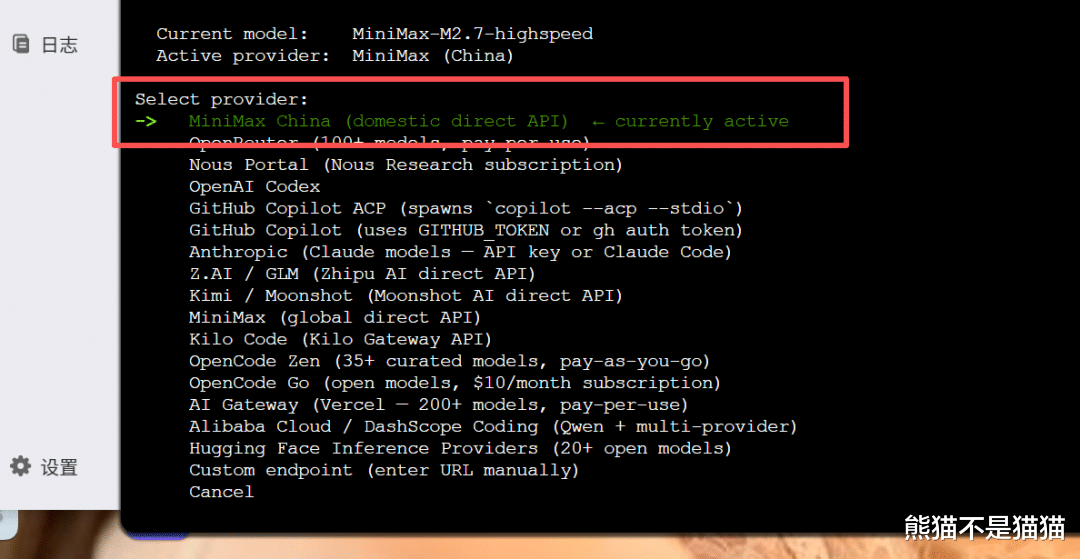 紧接着就是模型的设置,依然和Openclaw的配置一样,选择你要使用的模型渠道,填写key就行了,这里熊猫用的minimax。
